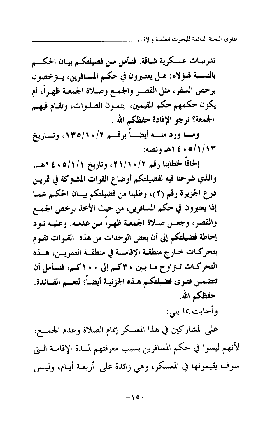 وما ورد منه أيضا برقم 2 \ 10 \ 135، وتاريخ 13 \ 1 \ 1405هـ ونصه: إلحاقا لخطابنا رقم 2 \ 10 \ 21، وتاريخ 1 \ 1 \ 1405هـ، والذي شرحنا فيه لفضيلتكم أوضاع القوات المشتركة في تمرين درع الجزيرة رقم (2) ، وطلبنا من فضيلتكم بيان الحكم عما إذا يعتبرون في حكم المسافرين، من حيث الأخذ برخص الجمع والقصر، وجعل صلاة الجمعة ظهرا من عدمه. وعليه نود إحاطة فضيلتكم إلى أن بعض الوحدات من هذه القوات تقوم بتحركات خارج منطقة الإقامة في منطقة التمرين، هذه التحركات تتراوح ما بين 30كم إلى 100كم، فنأمل أن تتضمن فتوى فضيلتكم هذه الجزئية أيضا؛ لتعم الفائدة. حفظكم الله.