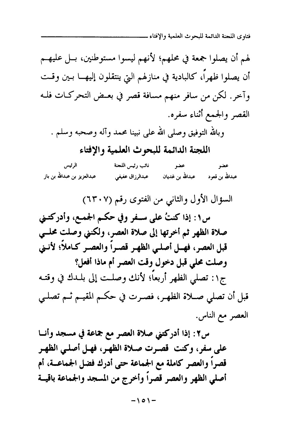س2: إذا أدركتني صلاة العصر مع جماعة في مسجد وأنا على سفر، وكنت قصرت صلاة الظهر، فهل أصلي الظهر قصرا والعصر كاملة مع الجماعة حتى أدرك فضل الجماعة، أم أصلي الظهر والعصر قصرا وأخرج من المسجد والجماعة باقية