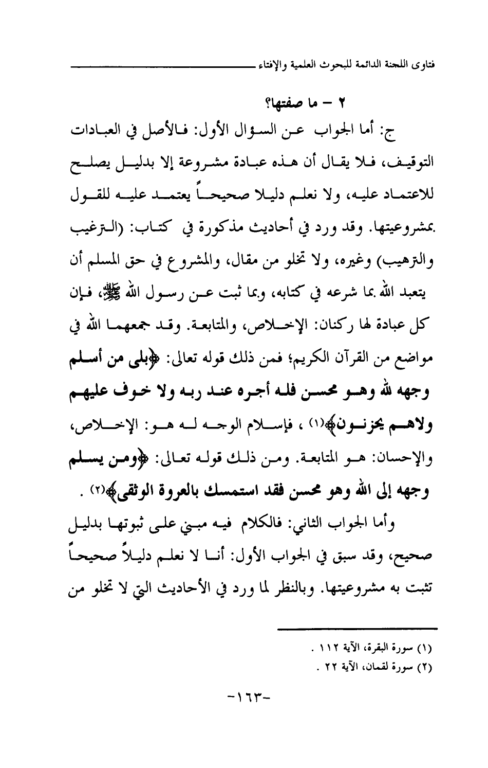 ج: أما الجواب عن السؤال الأول: فالأصل في العبادات التوقيف، فلا يقال أن هذه عبادة مشروعة إلا بدليل يصلح للاعتماد عليه، ولا نعلم دليلا صحيحا يعتمد عليه للقول بمشروعيتها. وقد ورد في أحاديث مذكورة في كتاب: (الترغيب والترهيب) وغيره، ولا تخلو من مقال، والمشروع في حق المسلم أن يتعبد الله بما شرعه في كتابه، وبما ثبت عن رسول الله صلى الله عليه وسلم، فإن كل عبادة لها ركنان: الإخلاص، والمتابعة. وقد جمعهما الله في مواضع من القرآن الكريم؛ فمن ذلك قوله تعالى: {بَلَى مَنْ أَسْلَمَ وَجْهَهُ لِلَّهِ وَهُوَ مُحْسِنٌ فَلَهُ أَجْرُهُ عِنْدَ رَبِّهِ وَلَا خَوْفٌ عَلَيْهِمْ وَلَا هُمْ يَحْزَنُونَ} (¬1) فإسلام الوجه له هو: الإخلاص، والإحسان: هو المتابعة. ومن ذلك قوله تعالى: {وَمَنْ يُسْلِمْ وَجْهَهُ إِلَى اللَّهِ وَهُوَ مُحْسِنٌ فَقَدِ اسْتَمْسَكَ بِالْعُرْوَةِ الْوُثْقَى} (¬2)