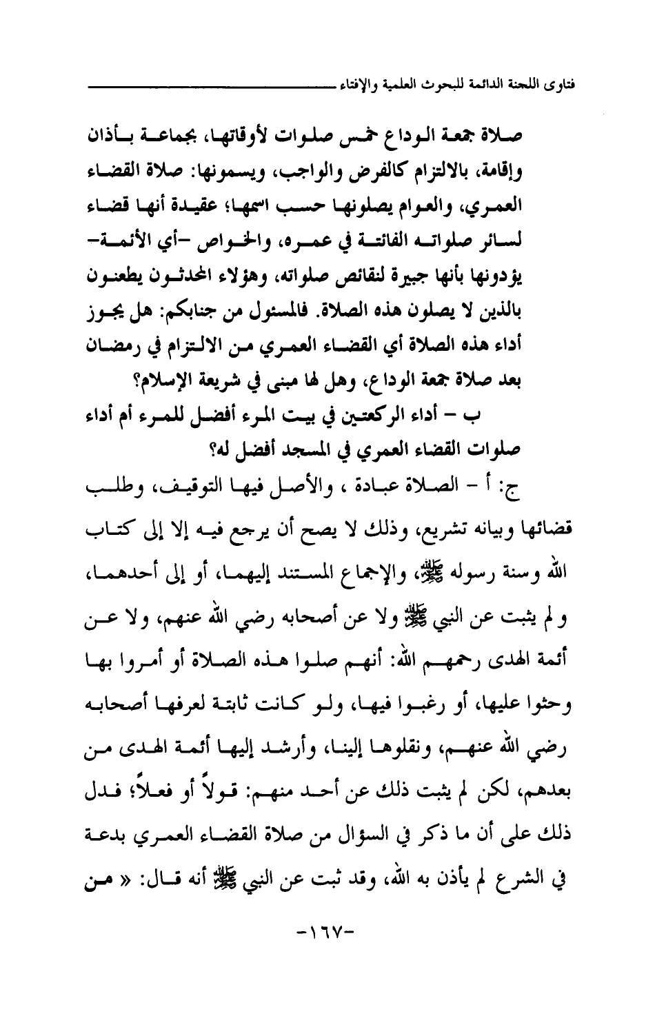 ج: أ - الصلاة عبادة، والأصل فيها التوقيف، وطلب قضائها وبيانه تشريع، وذلك لا يصح أن يرجع فيه إلا إلى كتاب الله وسنة رسوله صلى الله عليه وسلم، والإجماع المستند إليهما، أو إلى أحدهما، ولم يثبت عن النبي صلى الله عليه وسلم ولا عن أصحابه رضي الله عنهم، ولا عن أئمة الهدى رحمهم الله: أنهم صلوا هذه الصلاة أو أمروا بها وحثوا عليها، أو رغبوا فيها، ولو كانت ثابتة لعرفها أصحابه رضي الله عنهم، ونقلوها إلينا، وأرشد إليها أئمة الهدى من بعدهم، لكن لم يثبت ذلك عن أحد منهم: قولا أو فعلا؛ فدل ذلك على أن ما ذكر في السؤال من صلاة القضاء العمري بدعة في الشرع لم يأذن به الله، وقد ثبت عن النبي صلى الله عليه وسلم أنه قال: