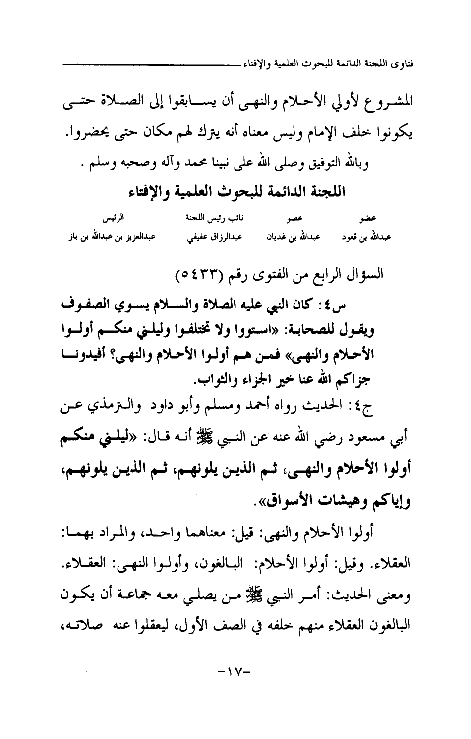 س4: «كان النبي عليه الصلاة والسلام يسوي الصفوف ويقول للصحابة: استووا ولا تختلفوا وليلني منكم أولوا الأحلام والنهى (¬1) » فمن هم أولوا الأحلام والنهى؟ أفيدونا جزاكم الله عنا خير الجزاء والثواب.
