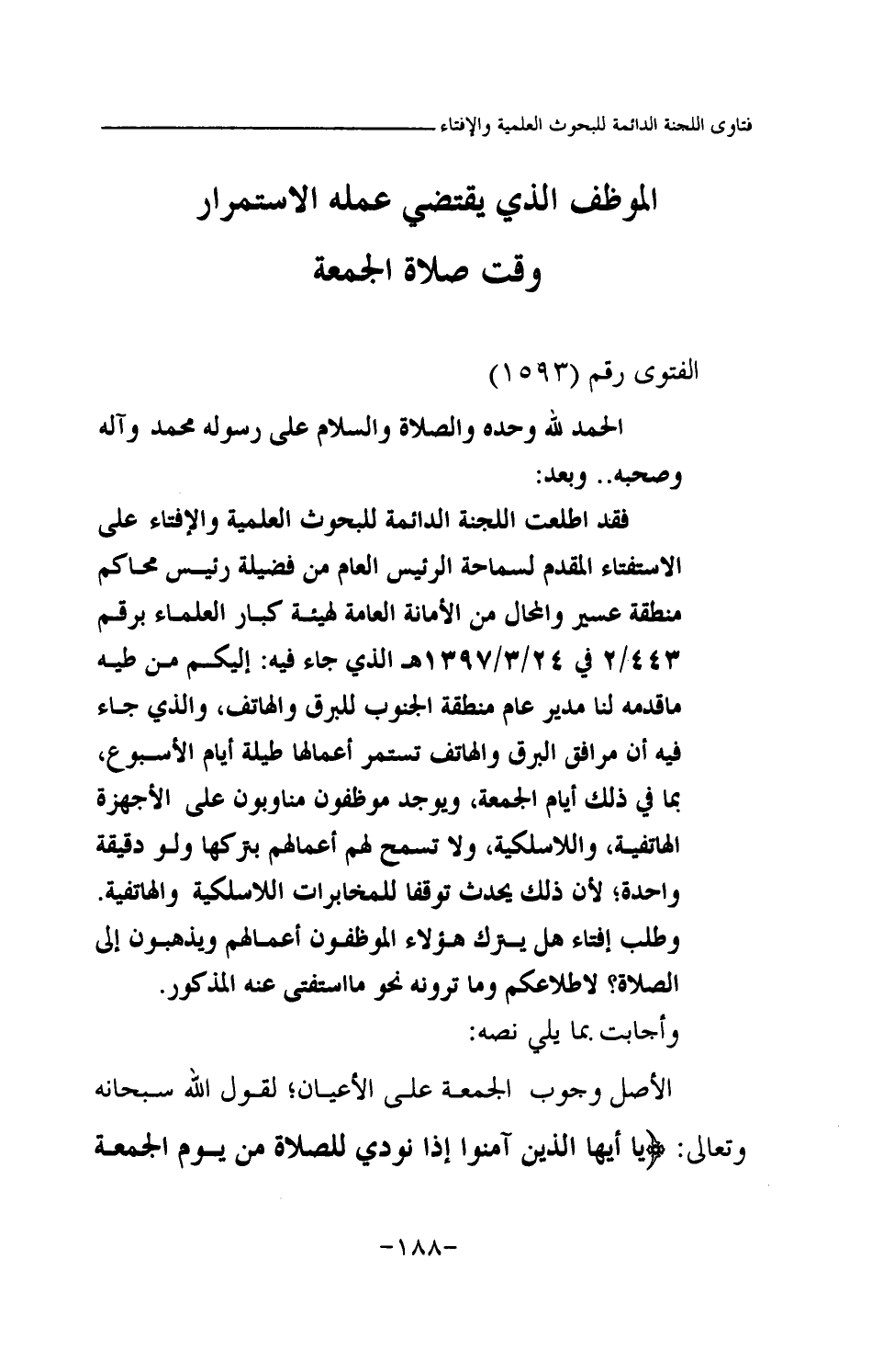 فقد اطلعت اللجنة الدائمة للبحوث العلمية والإفتاء على الاستفتاء المقدم لسماحة الرئيس العام من فضيلة رئيس محاكم منطقة عسير والمحال من الأمانة العامة لهيئة كبار العلماء برقم 443 \ 2 في 24 \ 3 \ 1397هـ الذي جاء فيه: إليكم من طيه ما قدمه لنا مدير عام منطقة الجنوب للبرق والهاتف، والذي جاء فيه أن مرافق البرق والهاتف تستمر أعمالها طيلة أيام الأسبوع، بما في ذلك أيام الجمعة، ويوجد موظفون مناوبون على الأجهزة الهاتفية، واللاسلكية، ولا تسمح لهم أعمالهم بتركها ولو دقيقة واحدة؛ لأن ذلك يحدث توقفا للمخابرات اللاسلكية والهاتفية. وطلب إفتاء هل يترك هؤلاء الموظفون أعمالهم ويذهبون إلى الصلاة؟ لاطلاعكم وما ترونه نحو ما استفتى عنه المذكور.