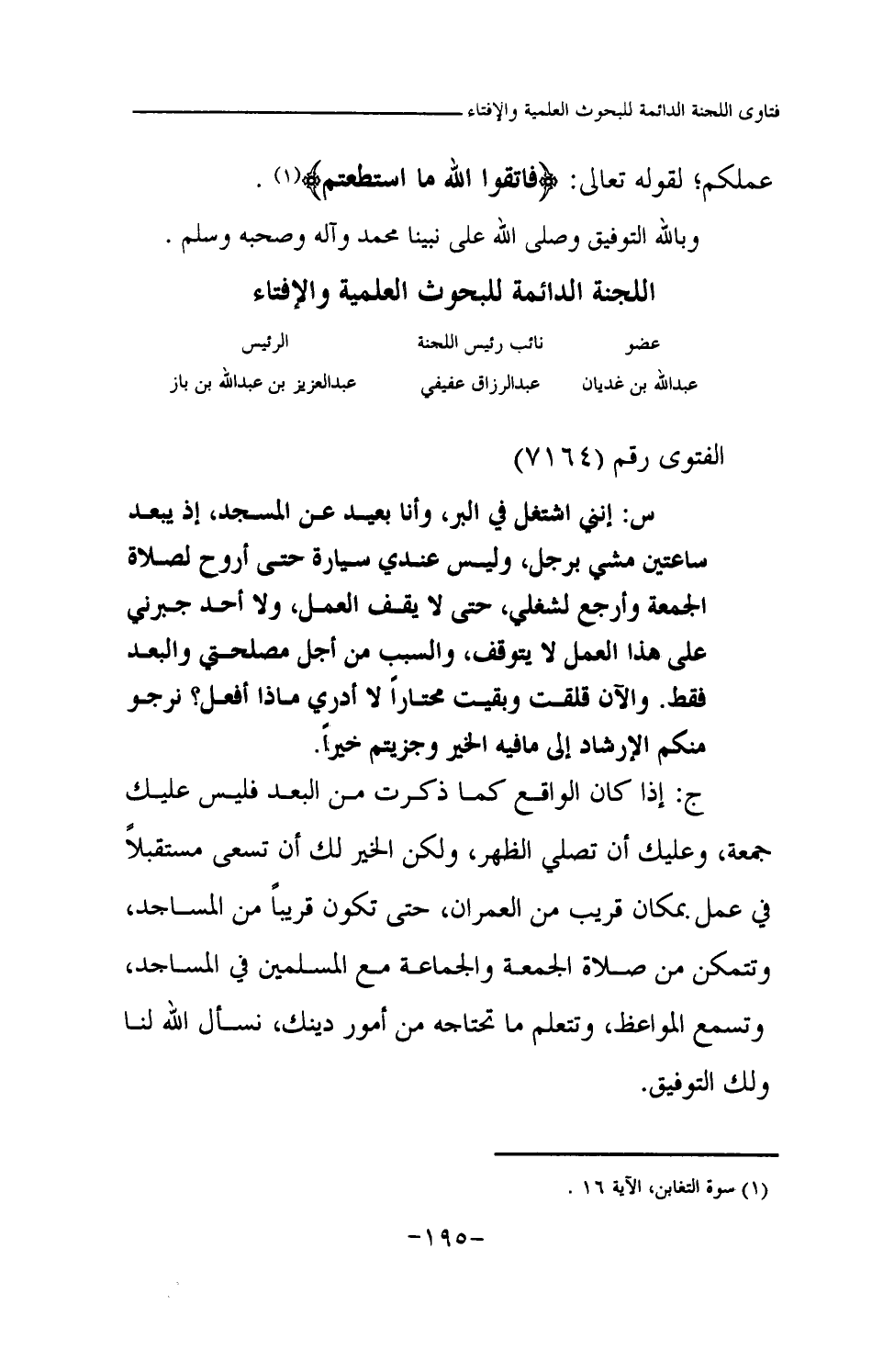 س: إنني اشتغل في البر، وأنا بعيد عن المسجد، إذ يبعد ساعتين مشي برجل، وليس عندي سيارة حتى أروح لصلاة الجمعة وأرجع لشغلي، حتى لا يقف العمل، ولا أحد جبرني على هذا العمل لا يتوقف، والسبب من أجل مصلحتي والبعد فقط. والآن قلقت وبقيت محتارا لا أدري ماذا أفعل؟ نرجو منكم الإرشاد إلى ما فيه الخير وجزيتم خيرا.