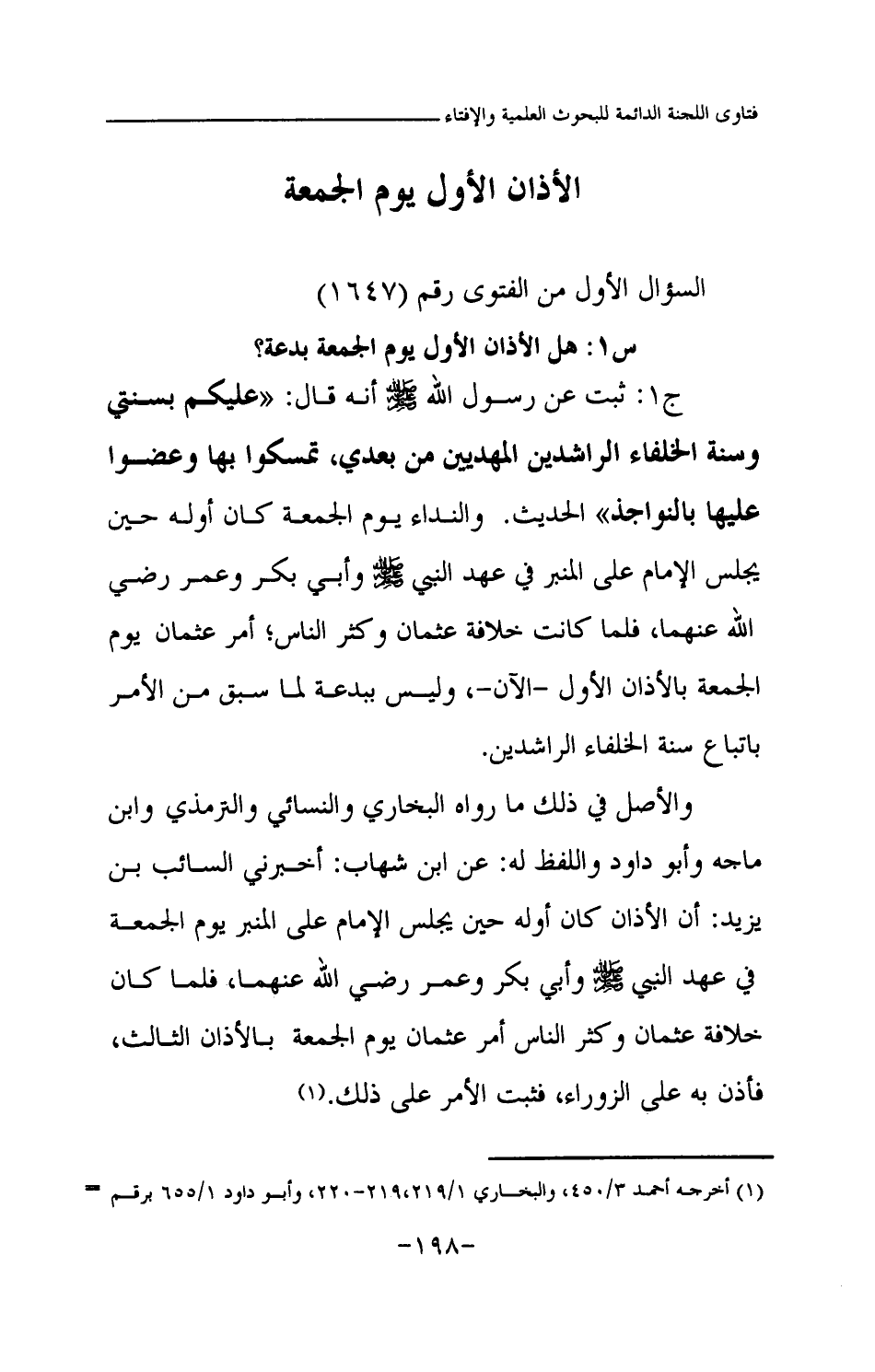ج1: ثبت عن رسول الله صلى الله عليه وسلم أنه قال: «عليكم بسنتي وسنة الخلفاء الراشدين المهديين من بعدي، تمسكوا بها وعضو اعليها بالنواجذ (¬1) » الحديث. والنداء يوم الجمعة كان أوله حين يجلس الإمام على المنبر في عهد النبي صلى الله عليه وسلم وأبي بكر وعمر رضي الله عنهما، فلما كانت خلافة عثمان وكثر الناس؛ أمر عثمان يوم الجمعة بالأذان الأول -الآن-، وليس ببدعة لما سبق من الأمر باتباع سنة الخلفاء الراشدين.