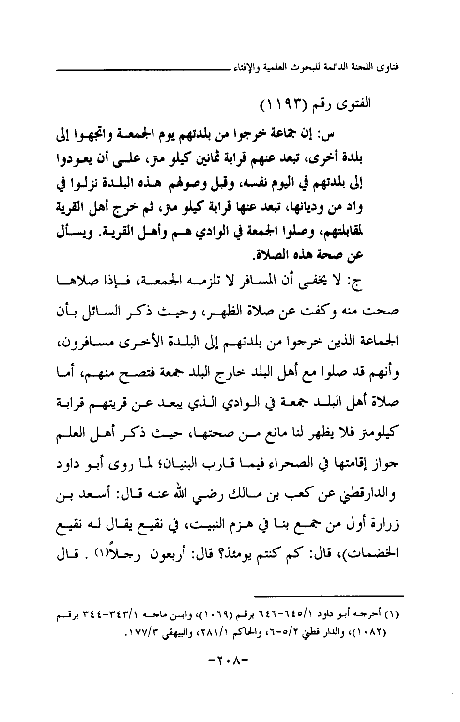 ج: لا يخفى أن المسافر لا تلزمه الجمعة، فإذا صلاها صحت منه وكفت عن صلاة الظهر، وحيث ذكر السائل بأن الجماعة الذين خرجوا من بلدتهم إلى البلدة الأخرى مسافرون، وأنهم قد صلوا مع أهل البلد خارج البلد جمعة فتصح منهم، أما صلاة أهل البلد جمعة في الوادي الذي يبعد عن قريتهم قرابة كيلو متر فلا يظهر لنا مانع من صحتها، حيث ذكر أهل العلم جواز إقامتها في الصحراء فيما قارب البنيان؛ لما روى أبو داود والدارقطني عن كعب بن مالك رضي الله عنه «قال: أسعد بن زرارة أول من جمع بنا في هزم النبيت، في نقيع يقال له نقيع الخضمات، قال: كم كنتم يومئذ؟ قال: أربعون رجلا (¬1) » قال