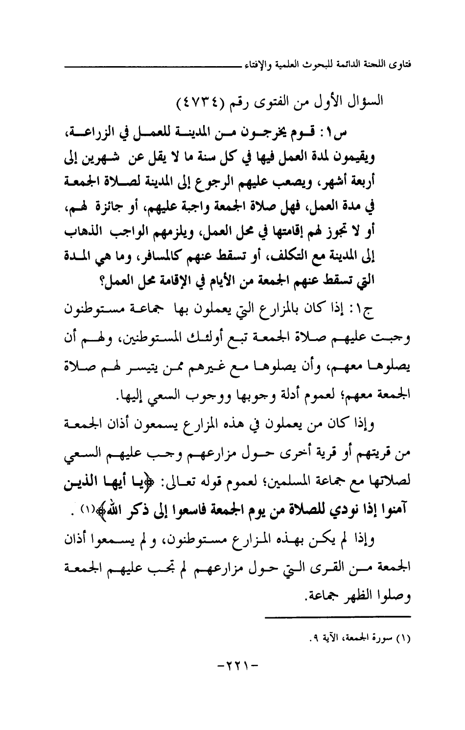 س1: قوم يخرجون من المدينة للعمل في الزراعة، ويقيمون لمدة العمل فيها في كل سنة ما لا يقل عن شهرين إلى أربعة أشهر، ويصعب عليهم الرجوع إلى المدينة لصلاة الجمعة في مدة العمل، فهل صلاة الجمعة واجبة عليهم، أو جائزة لهم، أو لا تجوز لهم إقامتها في محل العمل، ويلزمهم الواجب الذهاب إلى المدينة مع التكلف، أو تسقط عنهم كالمسافر، وما هي المدة التي تسقط عنهم الجمعة من الأيام في الإقامة محل العمل؟