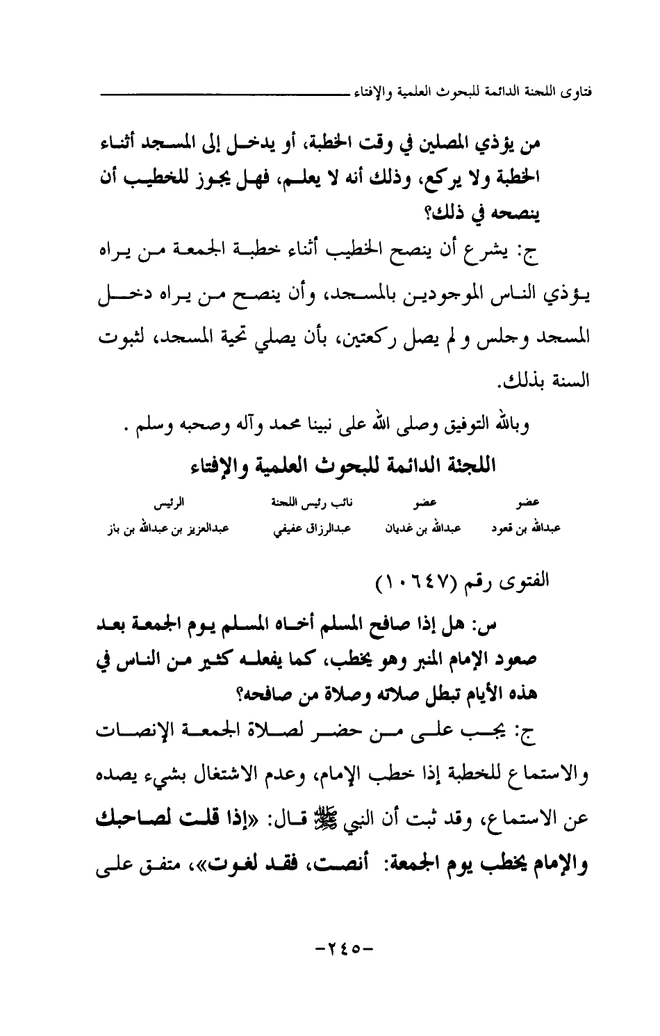 س: هل إذا صافح المسلم أخاه المسلم يوم الجمعة بعد صعود الإمام المنبر وهو يخطب، كما يفعله كثير من الناس في هذه الأيام تبطل صلاته وصلاة من صافحه؟