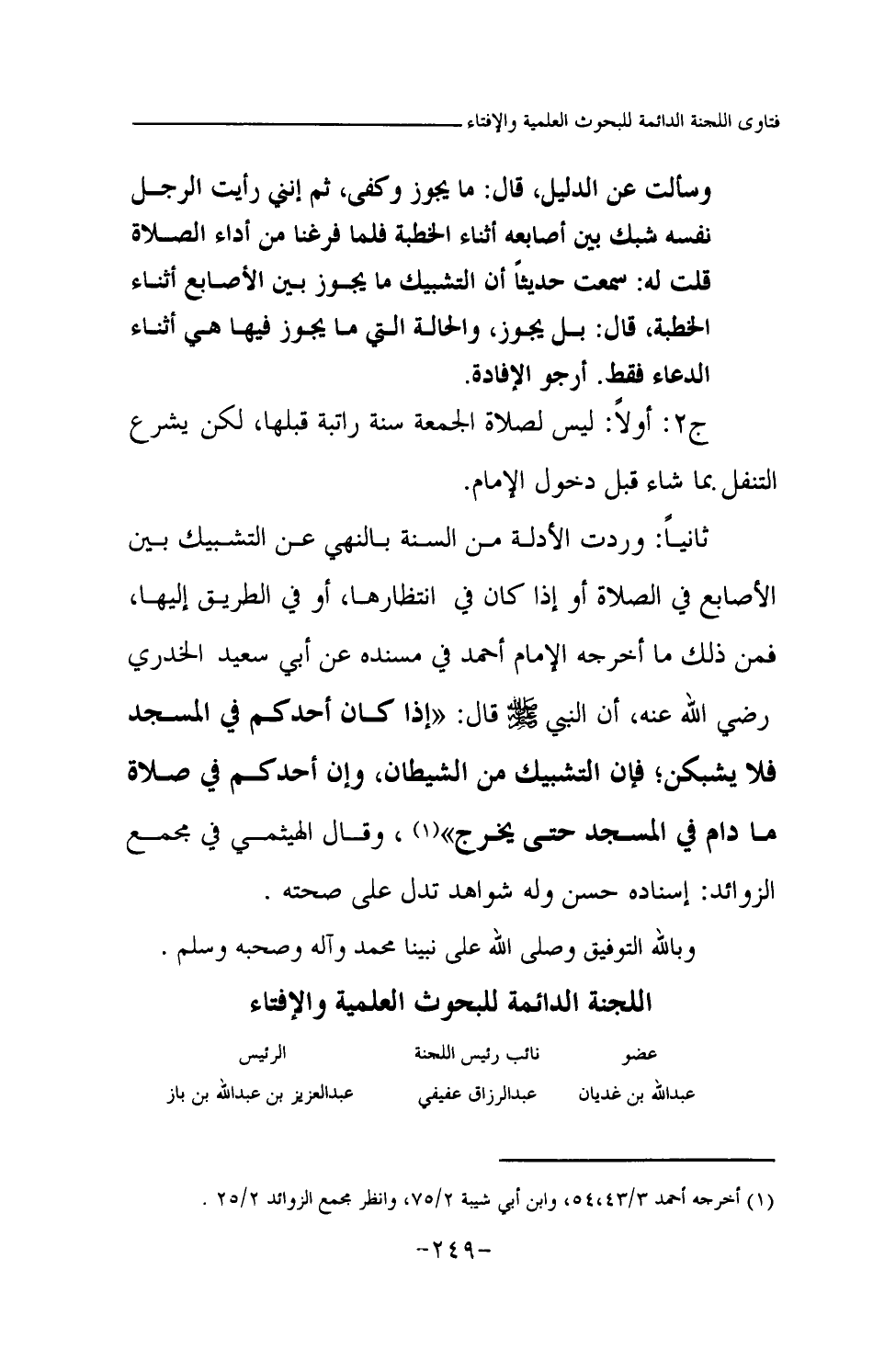 ج2: أولا: ليس لصلاة الجمعة سنة راتبة قبلها، لكن يشرع التنفل بما شاء قبل دخول الإمام. ثانيا: وردت الأدلة من السنة بالنهي عن التشبيك بين الأصابع في الصلاة أو إذا كان في انتظارها، أو في الطريق إليها، فمن ذلك ما أخرجه الإمام أحمد في مسنده عن أبي سعيد الخدري رضي الله عنه، أن النبي صلى الله عليه وسلم قال: «إذا كان أحدكم في المسجد فلا يشبكن؛ فإن التشبيك من الشيطان، وإن أحدكم في صلاة ما دام في المسجد حتى يخرج (¬1) » وقال الهيثمي في مجمع الزوائد: إسناده حسن وله شواهد تدل على صحته.