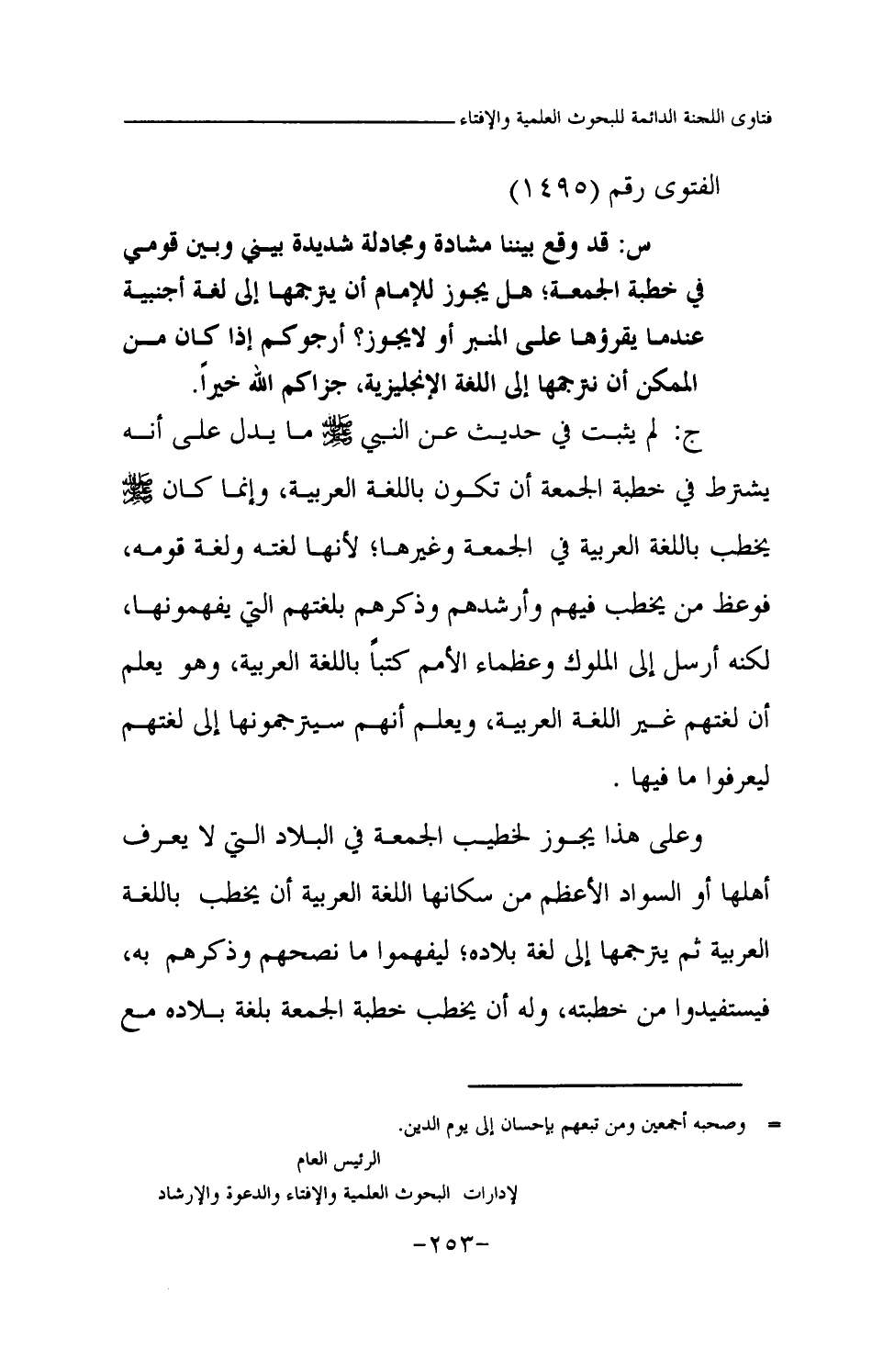 س: قد وقع بيننا مشادة ومجادلة شديدة بيني وبين قومي في خطبة الجمعة؛ هل يجوز للإمام أن يترجمها إلى لغة أجنبية عندما يقرؤها على المنبر أو لا يجوز؟ أرجوكم إذا كان من الممكن أن نترجمها إلى اللغة الإنجليزية، جزاكم الله خيرا.