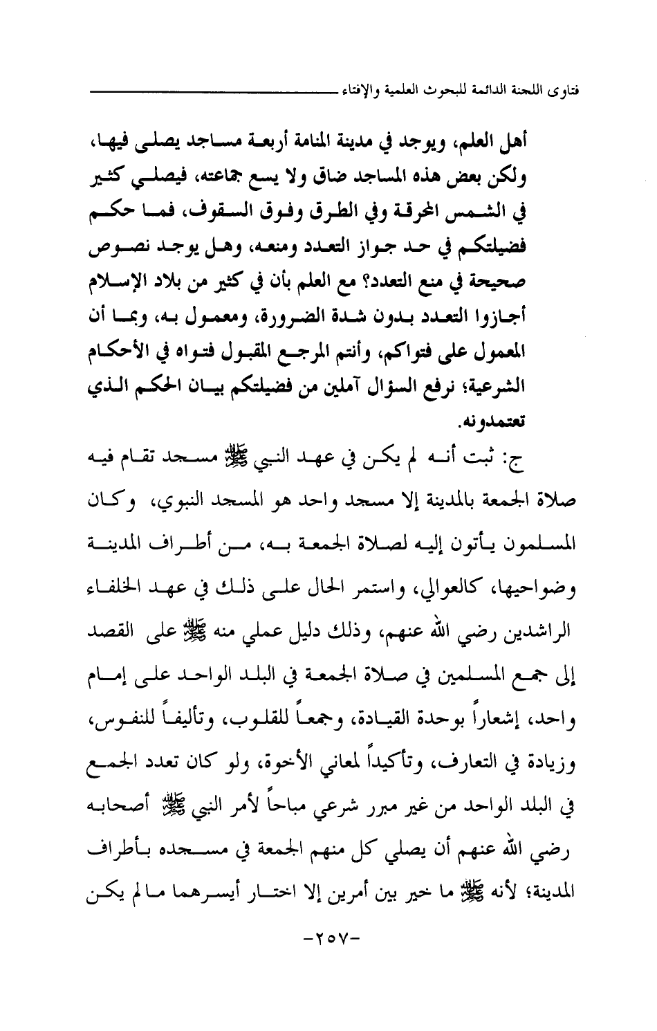 ج: ثبت أنه لم يكن في عهد النبي صلى الله عليه وسلم مسجد تقام فيه صلاة الجمعة بالمدينة إلا مسجد واحد هو المسجد النبوي، وكان المسلمون يأتون إليه لصلاة الجمعة به، من أطراف المدينة وضواحيها، كالعوالي، واستمر الحال على ذلك في عهد الخلفاء الراشدين رضي الله عنهم، وذلك دليل عملي منه صلى الله عليه وسلم على القصد إلى جمع المسلمين في صلاة الجمعة في البلد الواحد على إمام واحد، إشعارا بوحدة القيادة، وجمعا للقلوب، وتأليفا للنفوس، وزيادة في التعارف، وتأكيدا لمعاني الأخوة، ولو كان تعدد الجمع في البلد الواحد من غير مبرر شرعي مباحا لأمر النبي صلى الله عليه وسلم أصحابه رضي الله عنهم أن يصلي كل منهم الجمعة في مسجده بأطراف المدينة؛ لأنه صلى الله عليه وسلم ما خير بين أمرين إلا اختار أيسرهما ما لم يكن