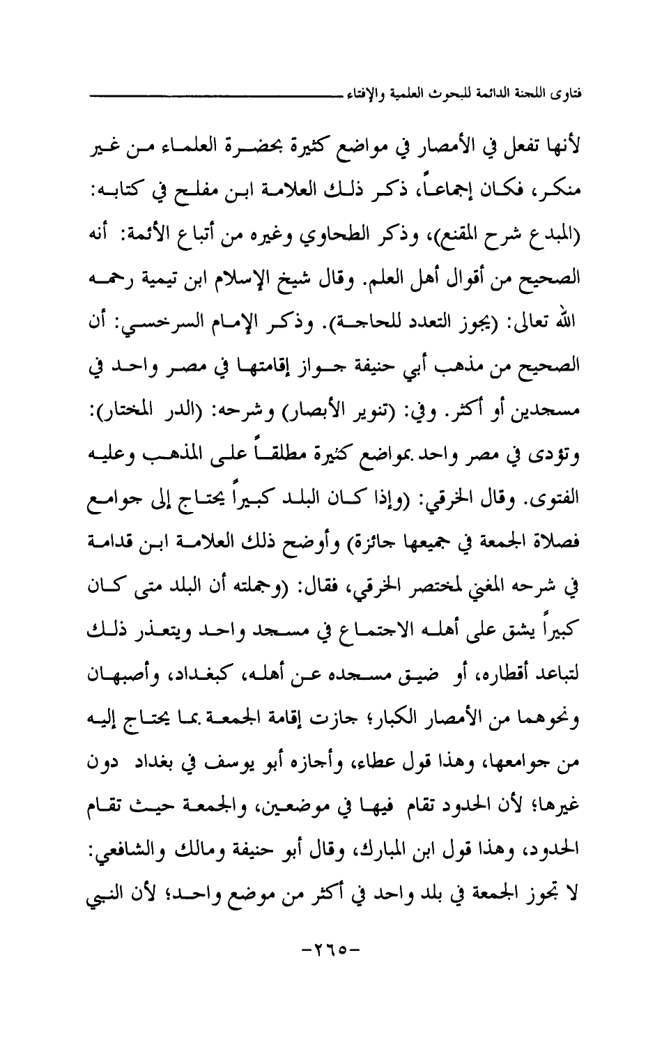 لأنها تفعل في الأمصار في مواضع كثيرة بحضرة العلماء من غير منكر، فكان إجماعا، ذكر ذلك العلامة ابن مفلح في كتابه: (المبدع شرح المقنع) ، وذكر الطحاوي وغيره من أتباع الأئمة: أنه الصحيح من أقوال أهل العلم. وقال شيخ الإسلام ابن تيمية رحمه الله تعالى: (يجوز التعدد للحاجة) . وذكر الإمام السرخسي: أن الصحيح من مذهب أبي حنيفة جواز إقامتها في مصر واحد في مسجدين أو أكثر. وفي: (تنوير الأبصار) وشرحه: (الدر المختار) : وتؤدى في مصر واحد بمواضع كثيرة مطلقا على المذهب وعليه الفتوى. وقال الخرقي: (وإذا كان البلد كبيرا يحتاج إلى جوامع فصلاة الجمعة في جميعها جائزة) وأوضح ذلك العلامة ابن قدامة في شرحه المغني لمختصر الخرقي، فقال: (وجملته أن البلد متى كان كبيرا يشق على أهله الاجتماع في مسجد واحد ويتعذر ذلك لتباعد أقطاره، أو ضيق مسجده عن أهله، كبغداد، وأصبهان ونحوهما من الأمصار الكبار؛ جازت إقامة الجمعة بما يحتاج إليه من جوامعها، وهذا قول عطاء، وأجازه أبو يوسف في بغداد دون غيرها؛ لأن الحدود تقام فيها في موضعين، والجمعة حيث تقام الحدود، وهذا قول ابن المبارك، وقال أبو حنيفة ومالك والشافعي: لا تجوز الجمعة في بلد واحد في أكثر من موضع واحد؛ لأن النبي