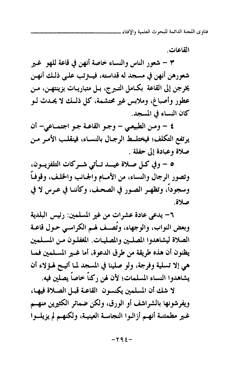 3 - شعور الناس والنساء خاصة أنهن في قاعة للهو غير شعورهن أنهن في مسجد له قداسته، فيترتب على ذلك أنهن يخرجن إلى القاعة بكامل التبرج، بل متباريات بزينتهن، من عطور وأصباغ، وملابس غير محتشمة، كل ذلك لا يحدث لو كان النساء في المسجد.