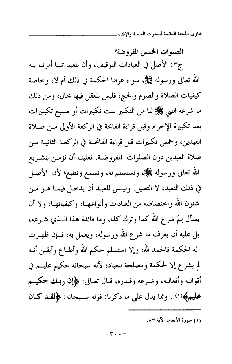 ج3: الأصل في العبادات التوقيف، وأن نتعبد بما أمرنا به الله تعالى ورسوله صلى الله عليه وسلم، سواء عرفنا الحكمة في ذلك أم لا، وخاصة كيفيات الصلاة والصوم والحج، فليس للعقل فيها مجال، ومن ذلك ما شرعه النبي صلى الله عليه وسلم لنا من التكبير ست تكبيرات أو سبع تكبيرات بعد تكبيرة الإحرام وقبل قراءة الفاتحة في الركعة الأولى من صلاة العيدين، وخمس تكبيرات قبل قراءة الفاتحة في الركعة الثانية من صلاة العيدين دون الصلوات المفروضة. فعلينا أن نؤمن بتشريع الله تعالى ورسوله صلى الله عليه وسلم، ونستسلم له، ونسمع ونطيع؛ لأن الأصل في ذلك التعبد، لا التعليل. وليس للعبد أن يدخل فيما هو من شئون الله واختصاصه من العبادات وأنواعها، وكيفياتها، ولا أن يسأل لم شرع الله كذا وترك كذا، وما فائدة هذا الذي شرعه، بل عليه أن يعرف ما شرع الله ورسوله، ويعمل به، فإن ظهرت له الحكمة فالحمد لله، وإلا استسلم لحكم الله وأطاع وأيقن أنه لم يشرع إلا لحكمة ومصلحة للعباد؛ لأنه سبحانه حكيم عليم في أقواله وأفعاله، وشرعه وقدره، قال تعالى: {إِنَّ رَبَّكَ حَكِيمٌ عَلِيمٌ} (¬1) ومما يدل على ما ذكرنا: قوله سبحانه: {لَقَدْ كَانَ لَكُمْ فِي رَسُولِ اللَّهِ أُسْوَةٌ حَسَنَةٌ} (¬2)