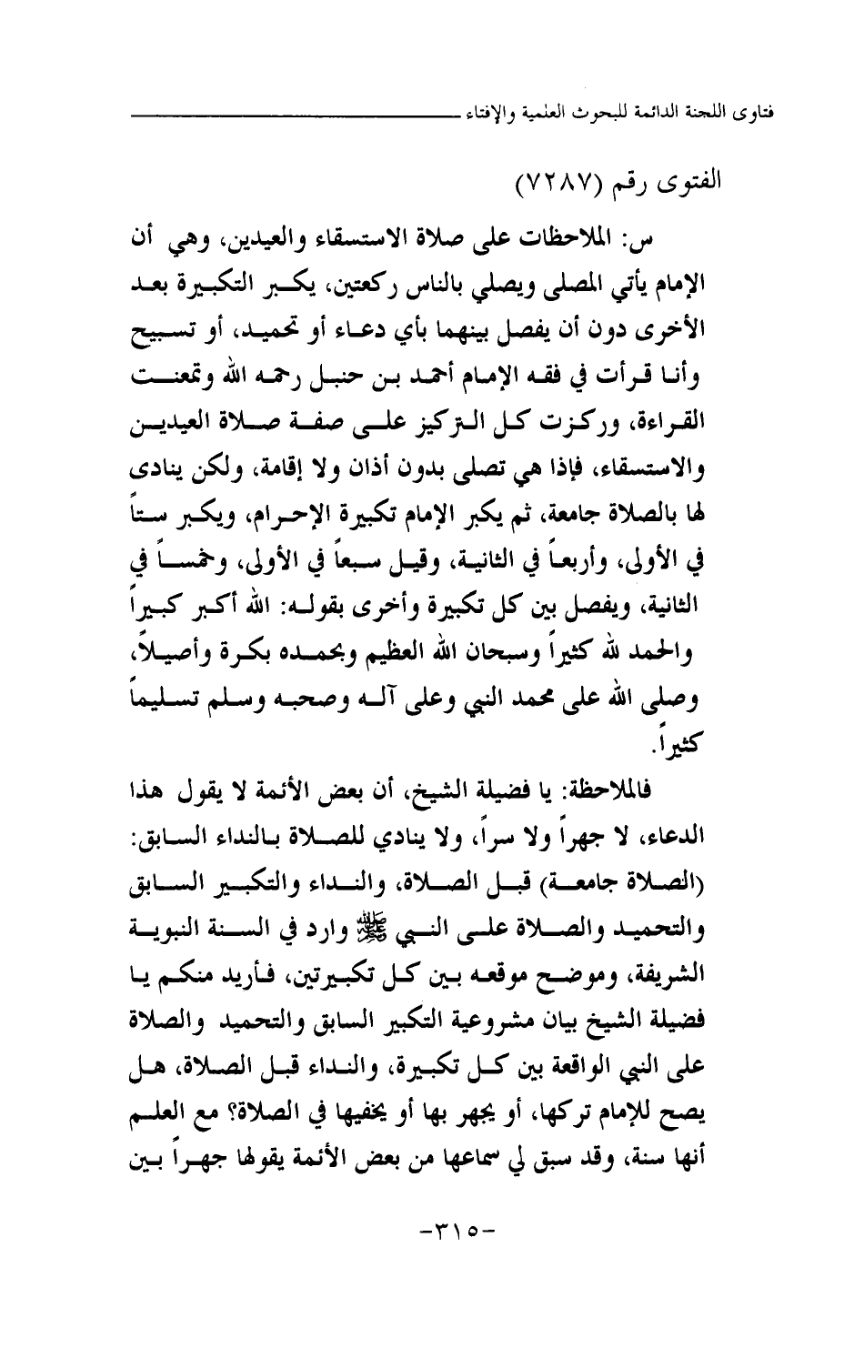 س: الملاحظات على صلاة الاستسقاء والعيدين، وهي أن الإمام يأتي المصلى ويصلي بالناس ركعتين، يكبر التكبيرة بعد الأخرى دون أن يفصل بينهما بأي دعاء أو تحميد، أو تسبيح وأنا قرأت في فقه الإمام أحمد بن حنبل رحمه الله وتمعنت القراءة، وركزت كل التركيز على صفة صلاة العيدين والاستسقاء، فإذا هي تصلى بدون أذان ولا إقامة، ولكن ينادى لها بالصلاة جامعة، ثم يكبر الإمام تكبيرة الإحرام، ويكبر ستا في الأولى، وأربعا في الثانية، وقيل سبعا في الأولى، وخمسا في الثانية، ويفصل بين كل تكبيرة وأخرى بقوله: الله أكبر كبيرا والحمد لله كثيرا وسبحان الله العظيم وبحمده بكرة وأصيلا، وصلى الله على محمد النبي وعلى آله وصحبه وسلم تسليما كثيرا.