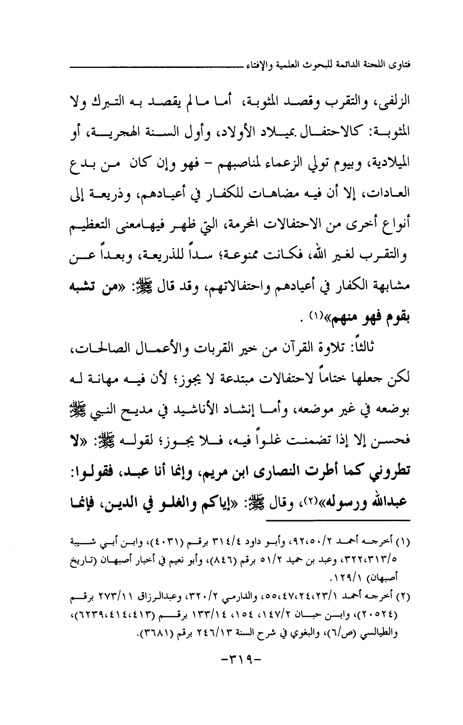 ثالثا: تلاوة القرآن من خير القربات والأعمال الصالحات، لكن جعلها ختاما لاحتفالات مبتدعة لا يجوز؛ لأن فيه مهانة له بوضعه في غير موضعه، وأما إنشاد الأناشيد في مديح النبي صلى الله عليه وسلم فحسن إلا إذا تضمنت غلوا فيه، فلا يجوز؛ لقوله صلى الله عليه وسلم: «لا تطروني كما أطرت النصارى ابن مريم، وإنما أنا عبد، فقولوا: عبد الله ورسوله (¬2) » وقال صلى الله عليه وسلم: «إياكم والغلو في الدين، فإنما أهلك من كان قبلكم الغلو (¬3) »
