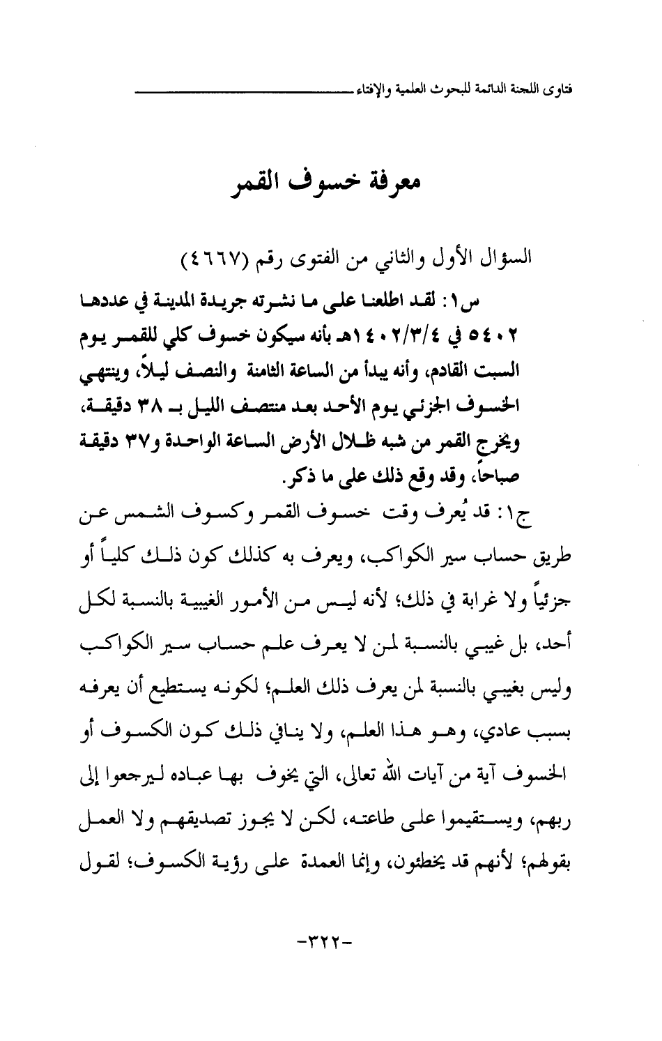 س1: لقد اطلعنا على ما نشرته جريدة المدينة في عددها 5402 في 4 \ 3 \ 1402هـ بأنه سيكون خسوف كلي للقمر يوم السبت القادم، وأنه يبدأ من الساعة الثامنة والنصف ليلا، وينتهي الخسوف الجزئي يوم الأحد بعد منتصف الليل بـ 38 دقيقة، ويخرج القمر من شبه ظلال الأرض الساعة الواحدة و37 دقيقة صباحا، وقد وقع ذلك على ما ذكر.