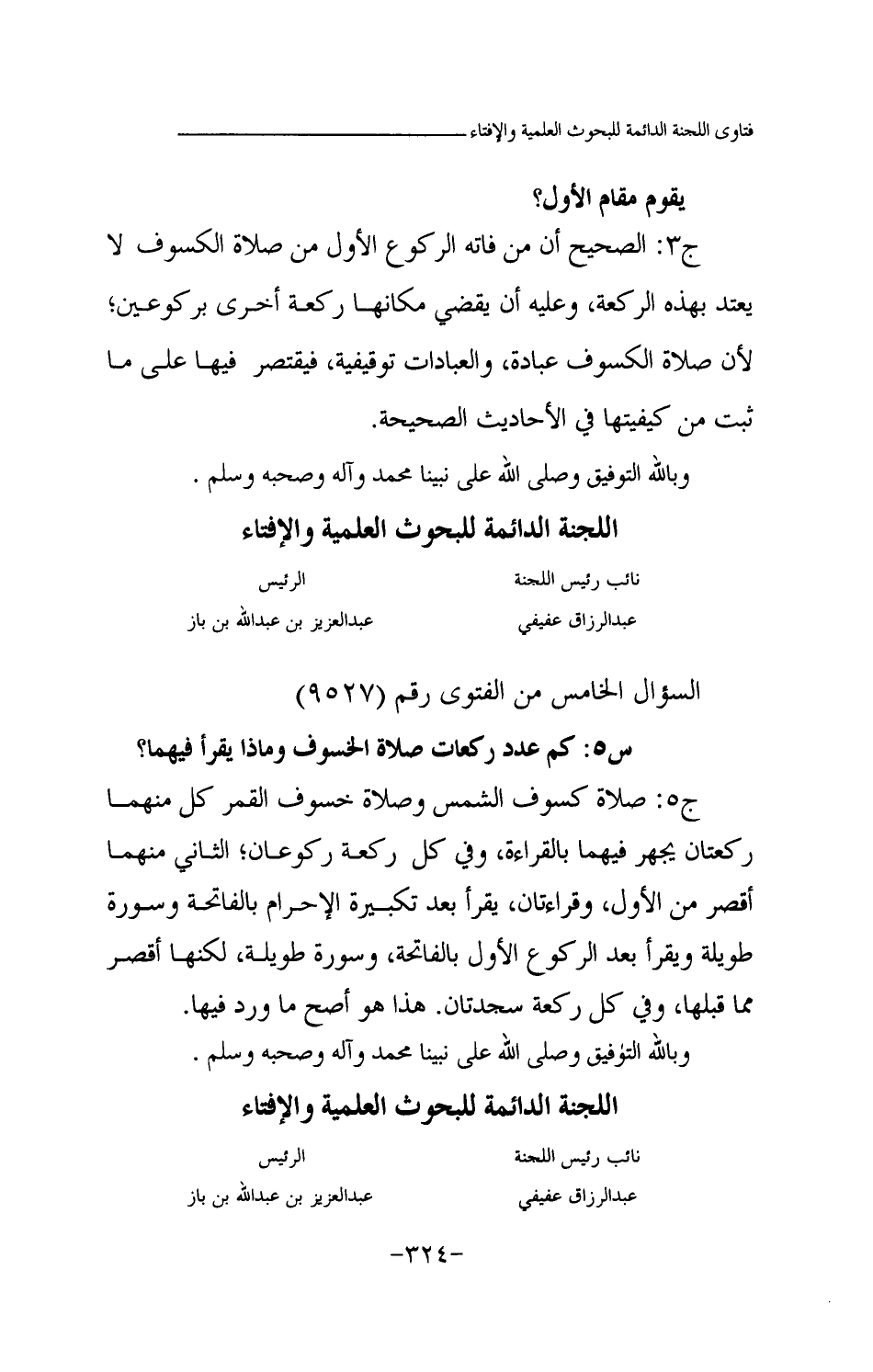 ج3: الصحيح أن من فاته الركوع الأول من صلاة الكسوف لا يعتد بهذه الركعة، وعليه أن يقضي مكانها ركعة أخرى بركوعين؛ لأن صلاة الكسوف عبادة، والعبادات توقيفية، فيقتصر فيها على ما ثبت من كيفيتها في الأحاديث الصحيحة.