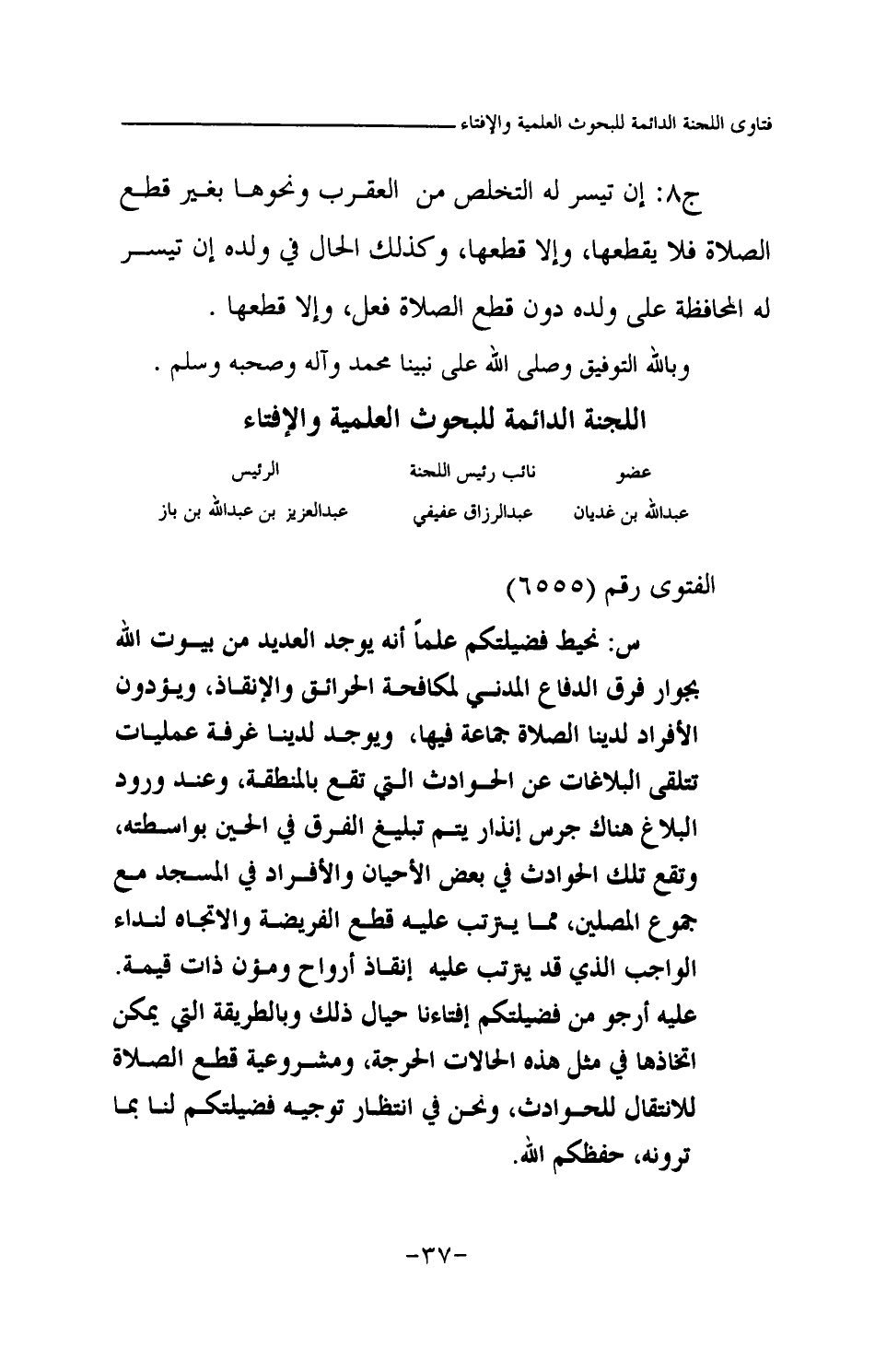 س: نحيط فضيلتكم علما أنه يوجد العديد من بيوت الله بجوار فرق الدفاع المدني لمكافحة الحرائق والإنقاذ، ويؤدون الأفراد لدينا الصلاة جماعة فيها، ويوجد لدينا غرفة عمليات تتلقى البلاغات عن الحوادث التي تقع بالمنطقة، وعند ورود البلاغ هناك جرس إنذار يتم تبليغ الفرق في الحين بواسطته، وتقع تلك الحوادث في بعض الأحيان والأفراد في المسجد مع جموع المصلين، مما يترتب عليه قطع الفريضة والاتجاه لنداء الواجب الذي قد يترتب عليه إنقاذ أرواح ومؤن ذات قيمة. عليه أرجو من فضيلتكم إفتاءنا حيال ذلك وبالطريقة التي يمكن اتخاذها في مثل هذه الحالات الحرجة، ومشروعية قطع الصلاة للانتقال للحوادث، ونحن في انتظار توجيه فضيلتكم لنا بما ترونه، حفظكم الله.
