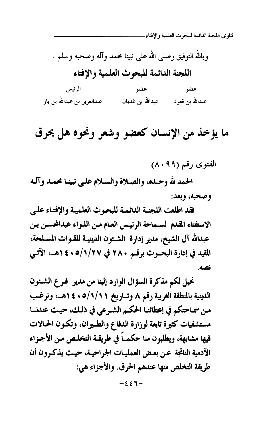 فقد اطلعت اللجنة الدائمة للبحوث العلمية والإفتاء على الاستفتاء المقدم لسماحة الرئيس العام من اللواء عبد المحسن بن عبد الله آل الشيخ، مدير إدارة الشئون الدينية للقوات المسلحة، المقيد في إدارة البحوث برقم 280 في 27 \ 1 \ 1405هـ، الآتي نصه. نحيل لكم مذكرة السؤال الوارد إلينا من مدير فرع الشئون الدينية بالمنطقة الغربية رقم 8 وتاريخ 11 \ 1 \ 1405هـ، ونرغب من سماحتكم في إعطائنا الحكم الشرعي في ذلك، حيث عندنا مستشفيات كثيرة تابعة لوزارة الدفاع والطيران، وتكون الحالات فيها مشابهة، ويطلبون منا حكما في طريقة التخلص من الأجزاء الآدمية الناتجة عن بعض العمليات الجراحية، حيث يذكرون أن طريقة التخلص منها عندهم الحرق. والأجزاء هي: