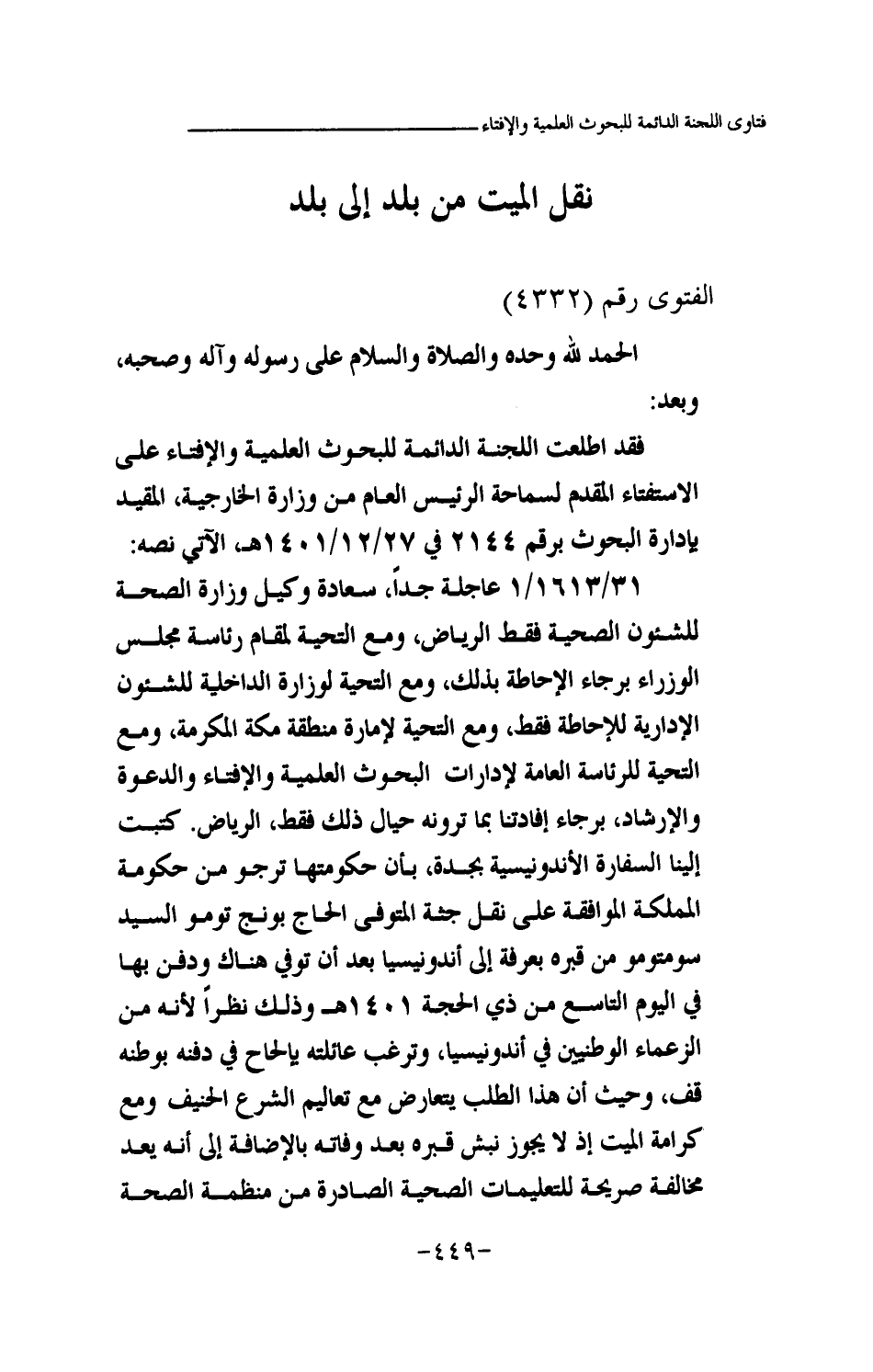 31 \ 1613 \ 1 عاجلة جدا، سعادة وكيل وزارة الصحة للشئون الصحية فقط الرياض، ومع التحية لمقام رئاسة مجلس الوزراء برجاء الإحاطة بذلك، ومع التحية لوزارة الداخلية للشئون الإدارية للإحاطة فقط، ومع التحية لإمارة منطقة مكة المكرمة، ومع التحية للرئاسة العامة لإدارات البحوث العلمية والإفتاء والدعوة والإرشاد، برجاء إفادتنا بما ترونه حيال ذلك فقط، الرياض. كتبت إلينا السفارة الأندونيسية بجدة، بأن حكومتها ترجو من حكومة المملكة الموافقة على نقل جثة المتوفى الحاج بونج تومو السيد سومتومو من قبره بعرفة إلى أندونيسيا بعد أن توفي هناك ودفن بها في اليوم التاسع من ذي الحجة 1401هـ وذلك نظرا لأنه من الزعماء الوطنيين في أندونيسيا، وترغب عائلته بإلحاح في دفنه بوطنه قف، وحيث أن هذا الطلب يتعارض مع تعاليم الشرع الحنيف ومع كرامة الميت إذ لا يجوز نبش قبره بعد وفاته بالإضافة إلى أنه يعد مخالفة صريحة للتعليمات الصحية الصادرة من منظمة الصحة