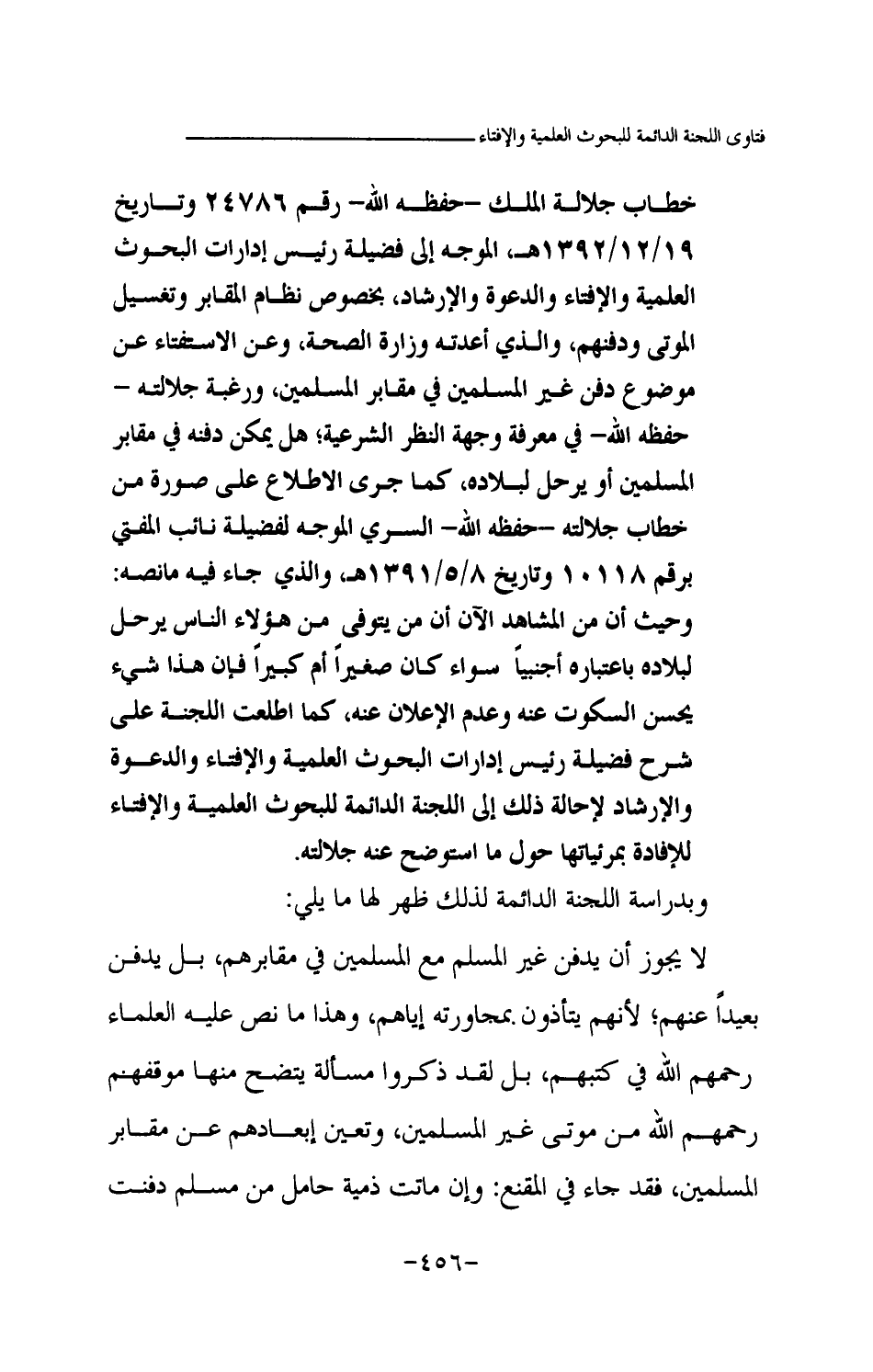 خطاب جلالة الملك -حفظه الله- رقم 24786 وتاريخ 19 \ 12 \ 1392هـ، الموجه إلى فضيلة رئيس إدارات البحوث العلمية والإفتاء والدعوة والإرشاد، بخصوص نظام المقابر وتغسيل الموتى ودفنهم، والذي أعدته وزارة الصحة، وعن الاستفتاء عن موضوع دفن غير المسلمين في مقابر المسلمين، ورغبة جلالته -حفظه الله- في معرفة وجهة النظر الشرعية؛ هل يمكن دفنه في مقابر المسلمين أو يرحل لبلاده، كما جرى الاطلاع على صورة من خطاب جلالته -حفظه الله- السري الموجه لفضيلة نائب المفتي برقم 10118 وتاريخ 8 \ 5 \ 1391هـ، والذي جاء فيه ما نصه: وحيث أن من المشاهد الآن أن من يتوفى من هؤلاء الناس يرحل لبلاده باعتباره أجنبيا سواء كان صغيرا أم كبيرا فإن هذا شيء يحسن السكوت عنه وعدم الإعلان عنه، كما اطلعت اللجنة على شرح فضيلة رئيس إدارات البحوث العلمية والإفتاء والدعوة والإرشاد لإحالة ذلك إلى اللجنة الدائمة للبحوث العلمية والإفتاء للإفادة بمرئياتها حول ما استوضح عنه جلالته.