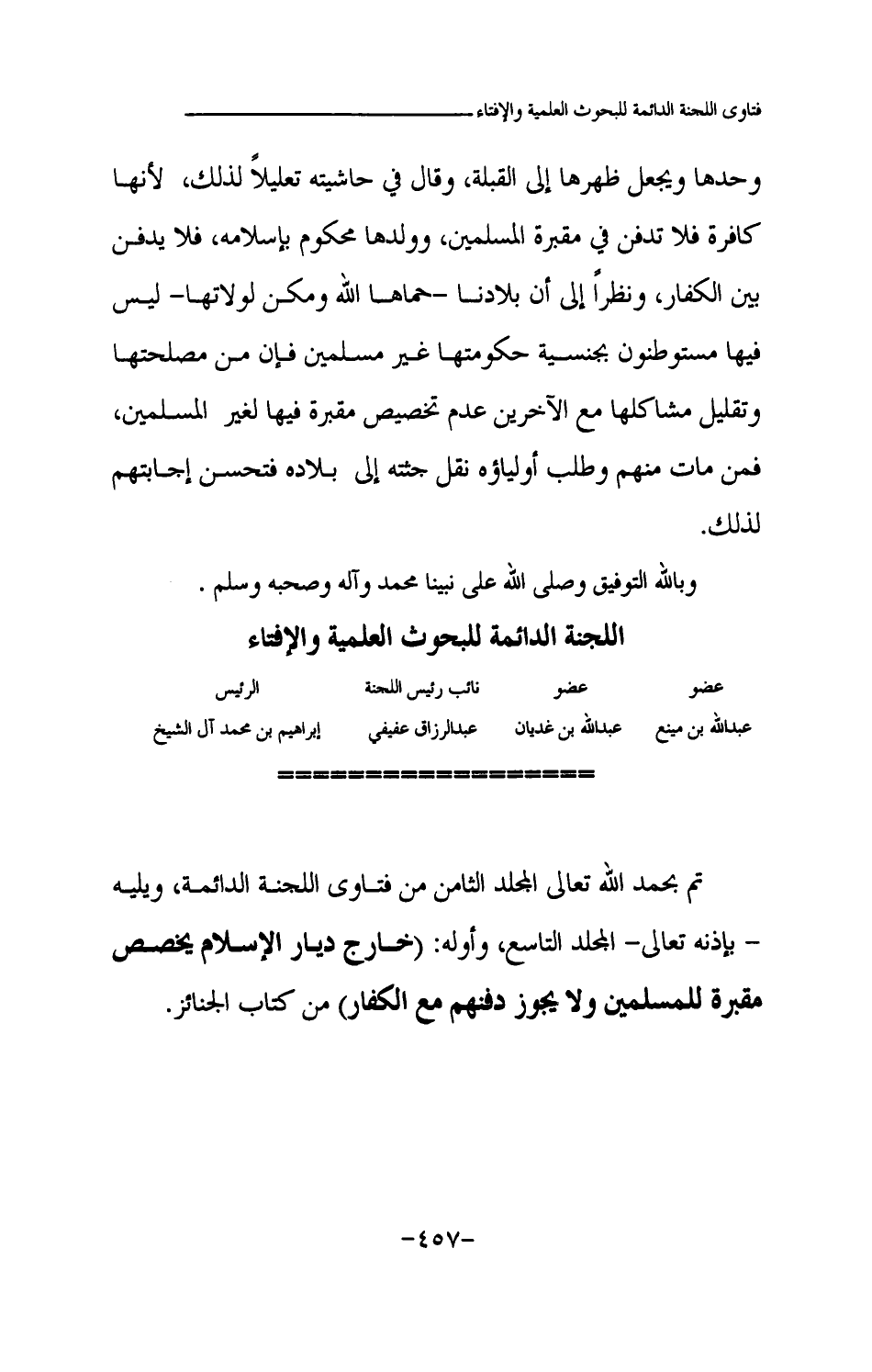 تم بحمد الله تعالى المجلد الثامن من فتاوى اللجنة الدائمة ويليه - بإذنه تعالى- المجلد التاسع وأوله: (خارج ديار الإسلام يخصص مقبرة للمسلمين ولا يجوز دفنهم مع الكفار) من كتاب الجنائز.