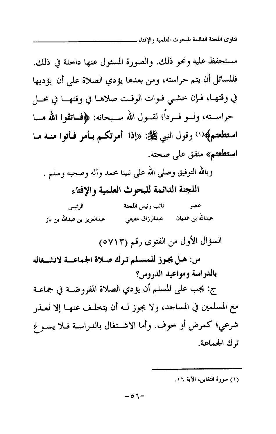 س: هل يجوز للمسلم ترك صلاة الجماعة لانشغاله بالدراسة ومواعيد الدروس؟