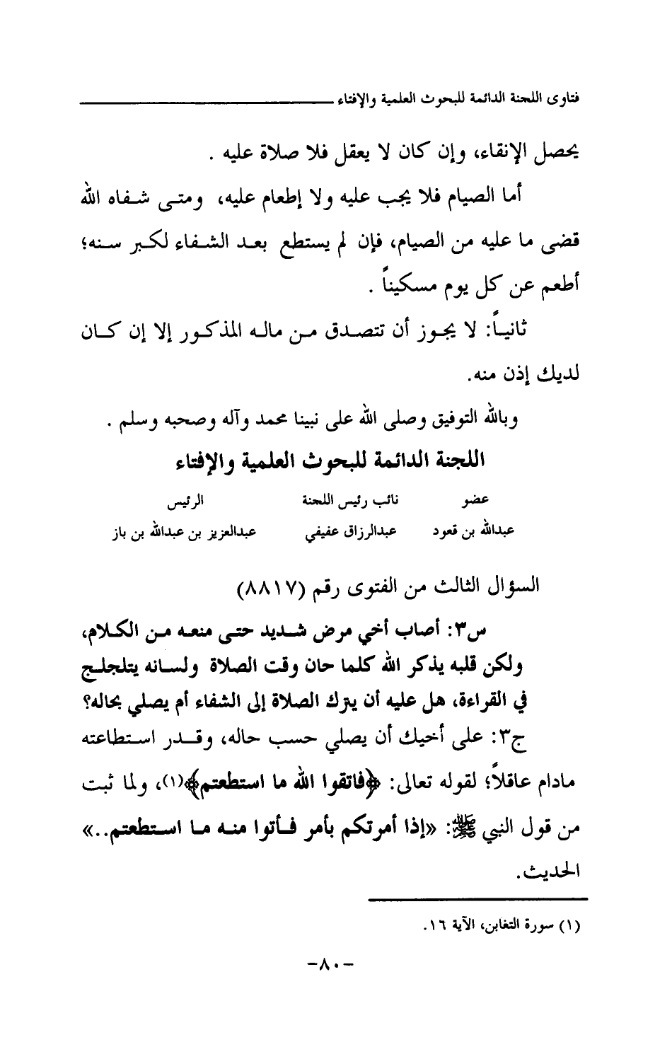 ج3: على أخيك أن يصلي حسب حاله، وقدر استطاعته ما دام عاقلا؛ لقوله تعالى: {فَاتَّقُوا اللَّهَ مَا اسْتَطَعْتُمْ} (¬1) ولما ثبت من قول النبي صلى الله عليه وسلم: «إذا أمرتكم بأمر فأتوا منه ما استطعتم (¬2) » الحديث.
