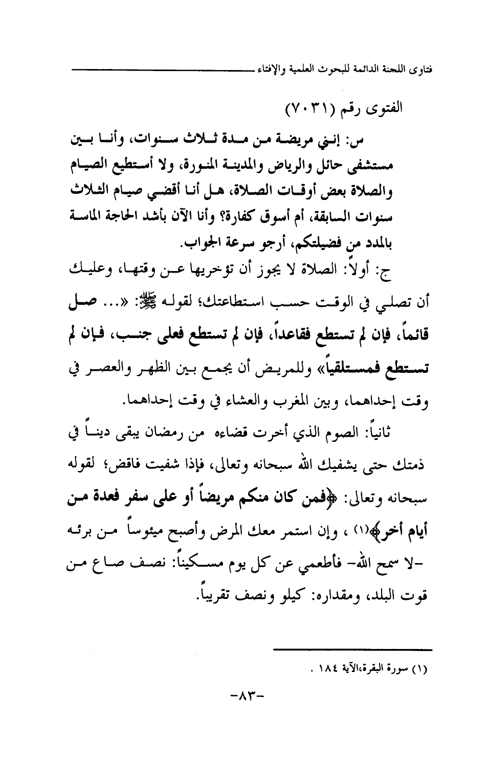 س: إنني مريضة من مدة ثلاث سنوات، وأنا بين مستشفى حائل والرياض والمدينة المنورة، ولا أستطيع الصيام والصلاة بعض أوقات الصلاة، هل أنا أقضي صيام الثلاث سنوات السابقة، أم أسوق كفارة؟ وأنا الآن بأشد الحاجة الماسة بالمدد من فضيلتكم، أرجو سرعة الجواب.