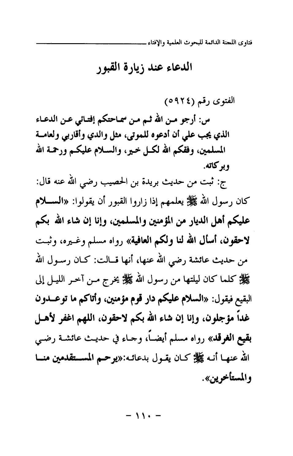 ج: ثبت من حديث بريدة بن الحصيب رضي الله عنه قال: «كان رسول الله صلى الله عليه وسلم يعلمهم إذا زاروا القبور أن يقولوا: السلام عليكم أهل الديار من المؤمنين والمسلمين، وإنا إن شاء الله بكم لاحقون، أسأل الله لنا ولكم العافية (¬1) » رواه مسلم وغيره وثبت من حديث عائشة رضي الله عنها، أنها قالت: «كان رسول الله صلى الله عليه وسلم كلما كان ليلتها من رسول الله صلى الله عليه وسلم يخرج من آخر الليل إلى البقيع فيقول: السلام عليكم دار قوم مؤمنين، وأتاكم ما توعدون غدا مؤجلون، وإنا إن شاء الله بكم لاحقون، اللهم اغفر لأهل بقيع الغرقد (¬2) » رواه مسلم أيضا وجاء في حديث عائشة رضي الله عنها أنه صلى الله عليه وسلم كان يقول بدعائه «يرحم المستقدمين منا والمستأخرين (¬3) » .