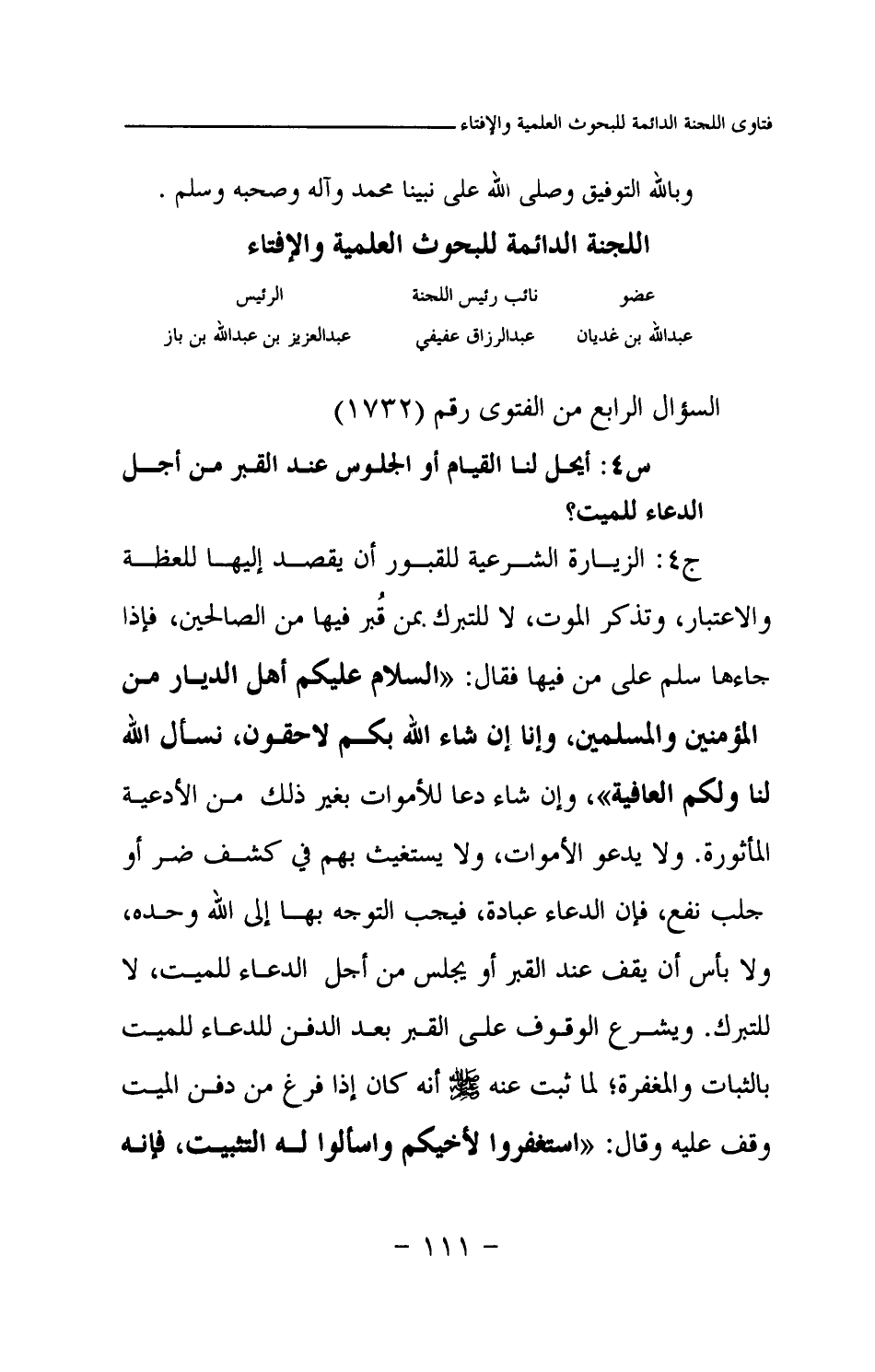 ج4: الزيارة الشرعية للقبور أن يقصد إليها للعظة والاعتبار، وتذكر الموت، لا للتبرك بمن قبر فيها من الصالحين، فإذا جاءها سلم على من فيها فقال: «السلام عليكم أهل الديار من المؤمنين والمسلمين، وإنا إن شاء الله بكم لاحقون، نسأل الله لنا ولكم العافية (¬1) » ، وإن شاء دعا للأموات بغير ذلك من الأدعية المأثورة. ولا يدعو الأموات، ولا يستغيث بهم في كشف ضر أو جلب نفع، فإن الدعاء عبادة، فيجب التوجه بها إلى الله وحده، ولا بأس أن يقف عند القبر أو يجلس من أجل الدعاء للميت، لا للتبرك. ويشرع الوقوف على القبر بعد الدفن للدعاء للميت بالثبات والمغفرة؛ لما ثبت عنه صلى الله عليه وسلم أنه كان إذا فرغ من دفن الميت وقف عليه وقال: «استغفروا لأخيكم واسألوا له التثبيت، فإنه