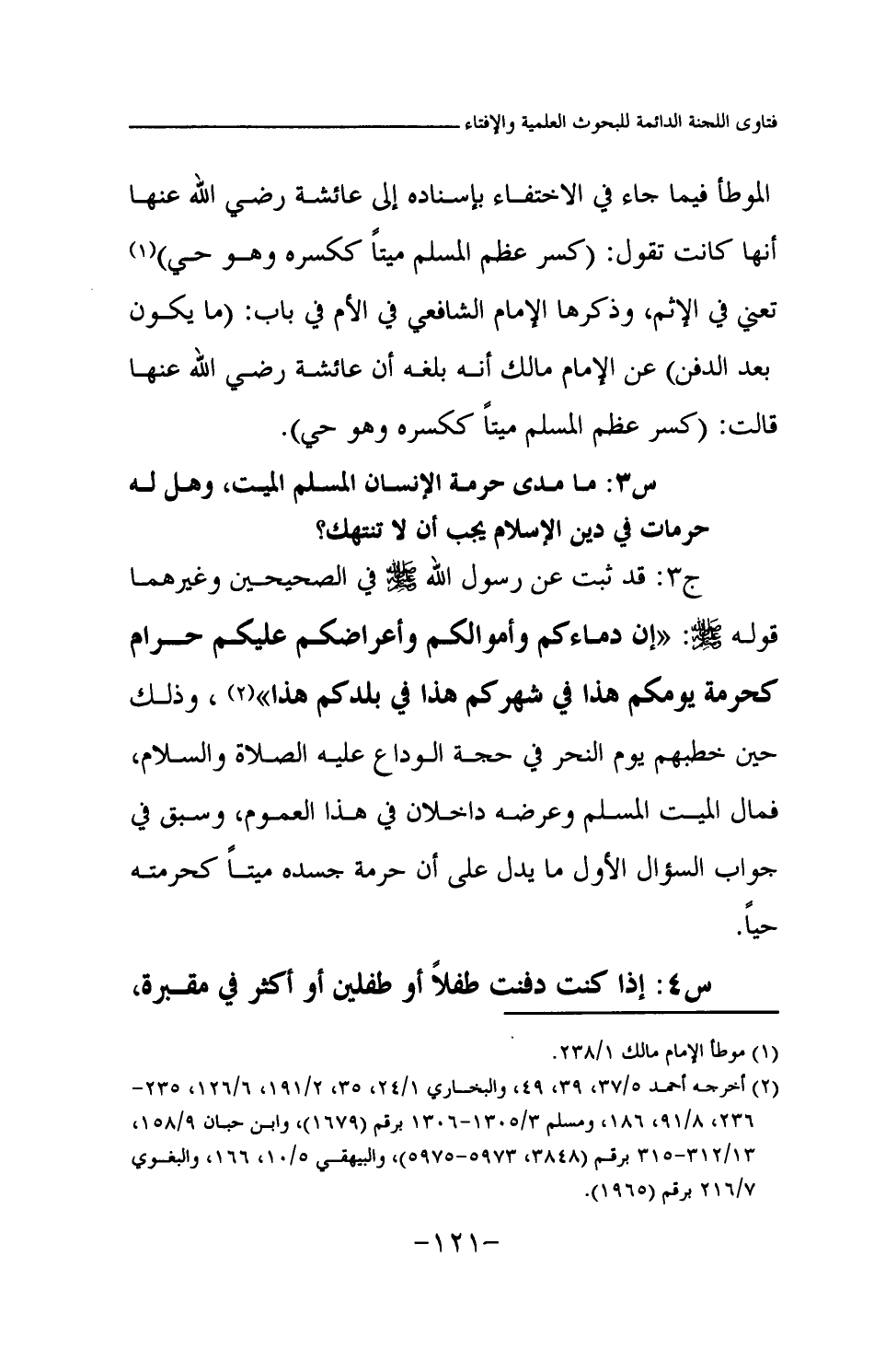 ج3: قد ثبت عن رسول الله صلى الله عليه وسلم في الصحيحين وغيرهما قوله صلى الله عليه وسلم: «إن دماءكم وأموالكم وأعراضكم عليكم حرام كحرمة يومكم هذا في شهركم هذا في بلدكم هذا (¬1) » وذلك حين خطبهم يوم النحر في حجة الوداع عليه الصلاة والسلام، فمال الميت المسلم وعرضه داخلان في هذا العموم، وسبق في جواب السؤال الأول ما يدل على أن حرمة جسده ميتا كحرمته حيا.