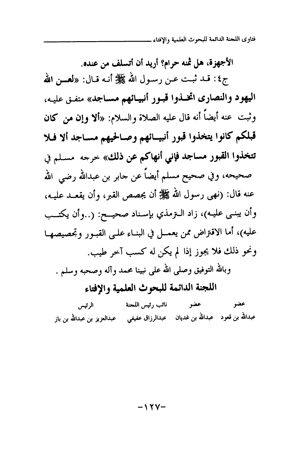 ج4: قد ثبت عن رسول الله صلى الله عليه وسلم أنه قال: «لعن الله اليهود والنصارى اتخذوا قبور أنبيائهم مساجد (¬1) » متفق عليه وثبت عنه أيضا أنه قال عليه الصلاة والسلام: «ألا وإن من كان قبلكم كانوا يتخذون قبور أنبيائهم وصالحيهم مساجد ألا فلا تتخذوا القبور مساجد فإني أنهاكم عن ذلك (¬2) » خرجه مسلم في صحيحه وفي صحيح مسلم أيضا عن جابر بن عبد الله رضي الله عنه قال: «نهى رسول الله صلى الله عليه وسلم أن يجصص القبر، وأن يقعد عليه، وأن يبنى عليه (¬3) » ، زاد الترمذي بإسناد صحيح: «وأن يكتب عليه (¬4) » ، أما الاقتراض ممن يعمل في البناء على القبور وتجصيصها ونحو ذلك فلا يجوز إذا لم يكن له كسب آخر طيب.