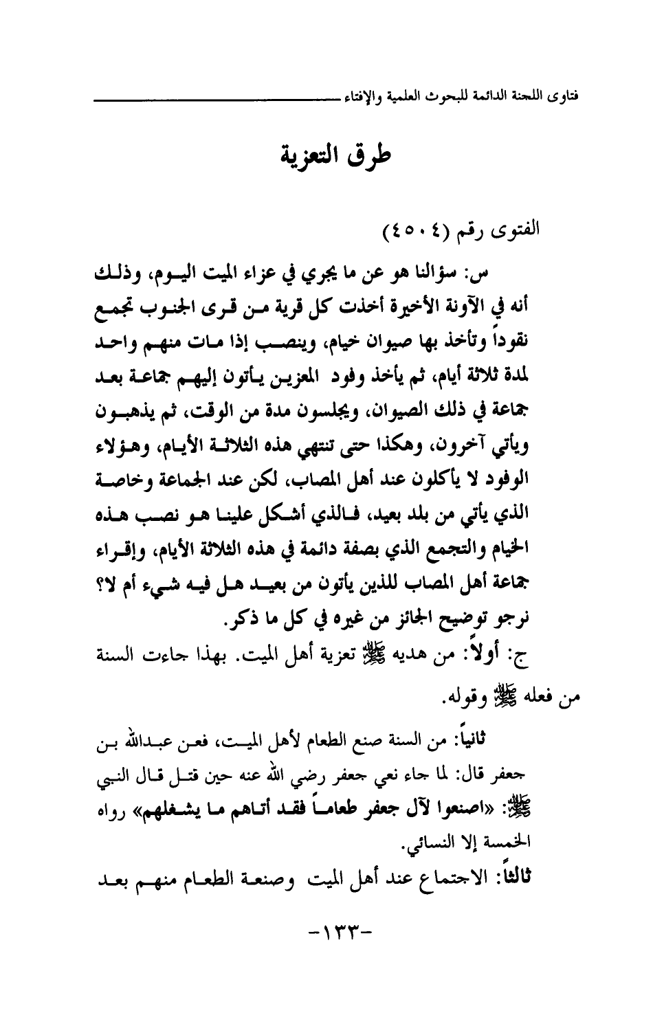 س: سؤالنا هو عن ما يجري في عزاء الميت اليوم، وذلك أنه في الآونة الأخيرة أخذت كل قرية من قرى الجنوب تجمع نقودا وتأخذ بها صيوان خيام، وينصب إذا مات منهم واحد لمدة ثلاثة أيام، ثم يأخذ وفود المعزين يأتون إليهم جماعة بعد جماعة في ذلك الصيوان، ويجلسون مدة من الوقت، ثم يذهبون ويأتي آخرون، وهكذا حتى تنتهي هذه الثلاثة الأيام، وهؤلاء الوفود لا يأكلون عند أهل المصاب، لكن عند الجماعة وخاصة الذي يأتي من بلد بعيد، فالذي أشكل علينا هو نصب هذه الخيام والتجمع الذي بصفة دائمة في هذه الثلاثة الأيام، وإقراء جماعة أهل المصاب للذين يأتون من بعيد هل فيه شيء أم لا؟ نرجو توضيح الجائز من غيره في كل ما ذكر.