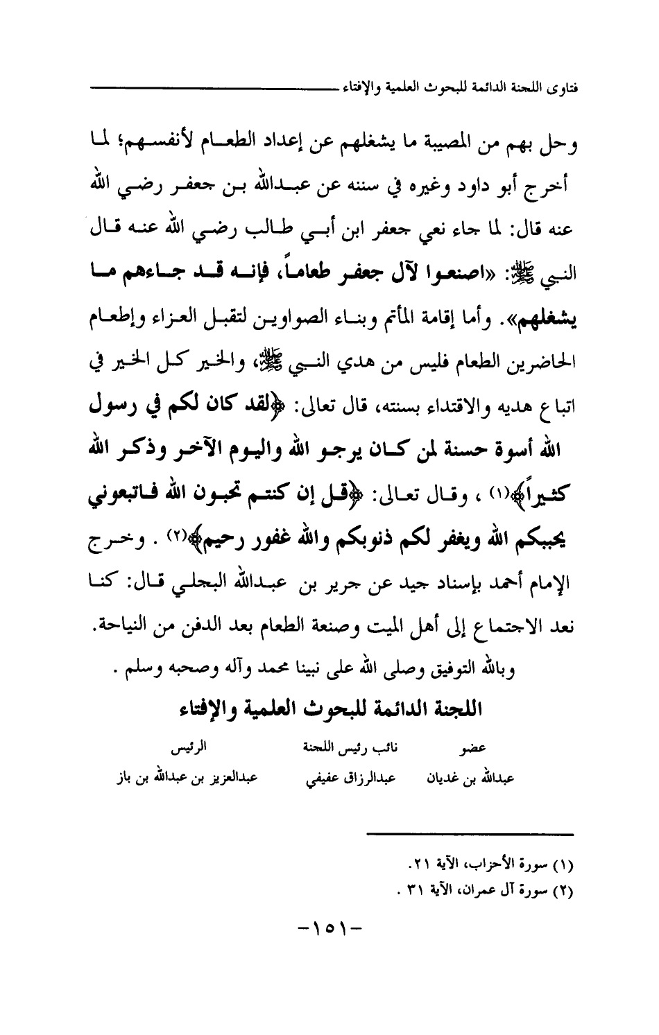 وحل بهم من المصيبة ما يشغلهم عن إعداد الطعام لأنفسهم؛ لما أخرج أبو داود وغيره في سننه عن عبد الله بن جعفر رضي الله عنه قال: «لما جاء نعي جعفر بن أبي طالب رضي الله عنه قال النبي صلى الله عليه وسلم: اصنعوا لآل جعفر طعاما، فإنه قد جاءهم ما يشغلهم (¬1) » . وأما إقامة المأتم وبناء الصواوين لتقبل العزاء وإطعام الحاضرين الطعام فليس من هدي النبي صلى الله عليه وسلم، والخير كل الخير في اتباع هديه والاقتداء بسنته، قال تعالى: {لَقَدْ كَانَ لَكُمْ فِي رَسُولِ اللَّهِ أُسْوَةٌ حَسَنَةٌ لِمَنْ كَانَ يَرْجُو اللَّهَ وَالْيَوْمَ الْآخِرَ وَذَكَرَ اللَّهَ كَثِيرًا} (¬2) وقال تعالى: {قُلْ إِنْ كُنْتُمْ تُحِبُّونَ اللَّهَ فَاتَّبِعُونِي يُحْبِبْكُمُ اللَّهُ وَيَغْفِرْ لَكُمْ ذُنُوبَكُمْ وَاللَّهُ غَفُورٌ رَحِيمٌ} (¬3) وخرج الإمام أحمد بإسناد جيد عن جرير بن عبد الله البجلي قال: «كنا نعد الاجتماع إلى أهل الميت وصنعة الطعام بعد الدفن من النياحة (¬4) » .