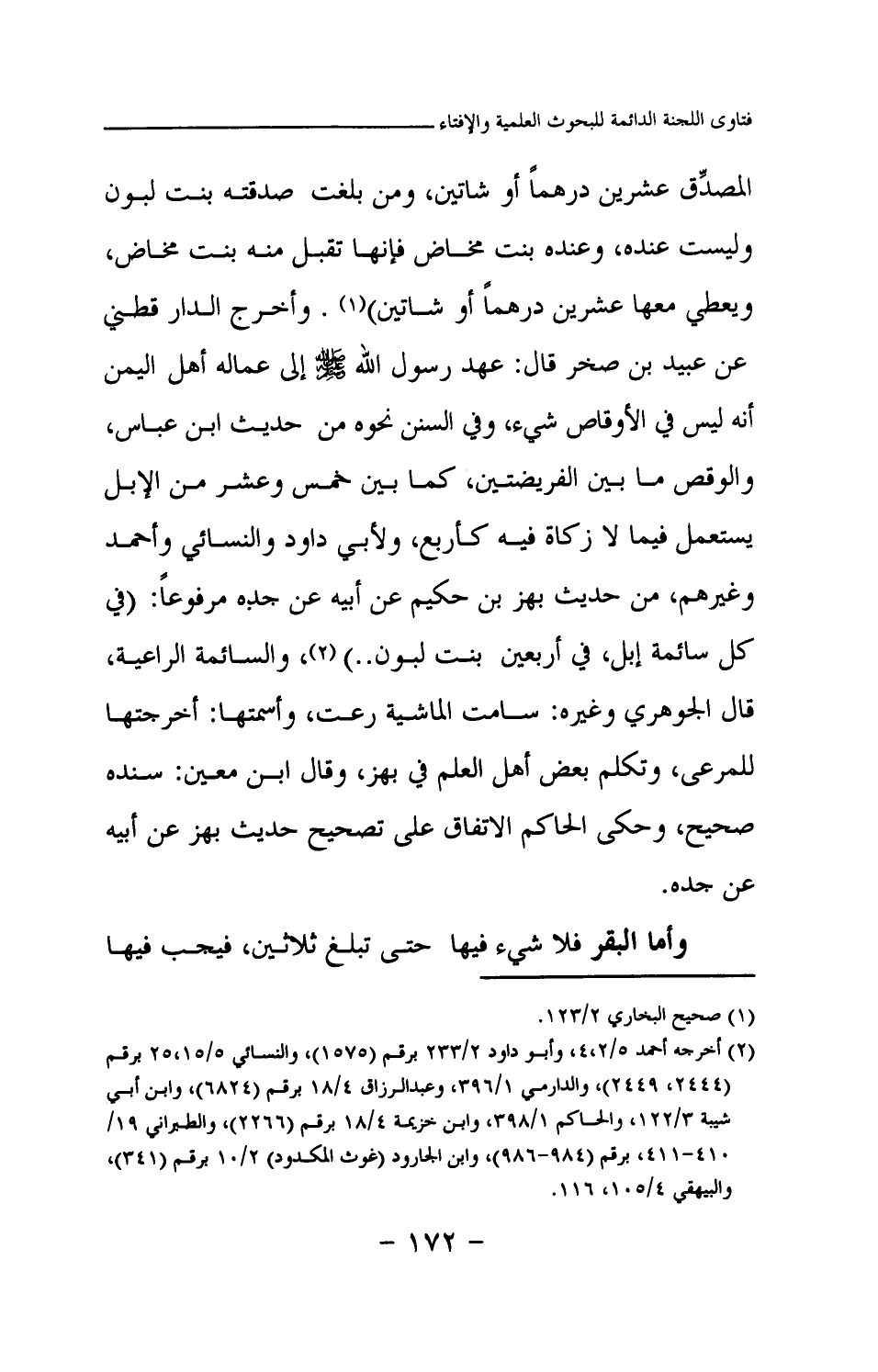 المصدق عشرين درهما أو شاتين، ومن بلغت صدقته بنت لبون وليست عنده، وعنده بنت مخاض فإنها تقبل منه بنت مخاض، ويعطي معها عشرين درهما أو شاتين (¬1) » . وأخرج الدارقطني عن عبيد بن صخر قال: «عهد رسول الله صلى الله عليه وسلم إلى عماله أهل اليمن أنه ليس في الأوقاص شيء (¬2) » ، وفي السنن نحوه من حديث ابن عباس، والوقص ما بين الفريضتين، كما بين خمس وعشر من الإبل يستعمل فيما لا زكاة فيه كأربع، ولأبي داود والنسائي وأحمد وغيرهم، من حديث بهز بن حكيم عن أبيه عن جده مرفوعا: «في كل سائمة إبل، في أربعين بنت لبون (¬3) » .. والسائمة الراعية، قال الجوهري وغيره: سامت الماشية رعت، وأسمتها: أخرجتها للمرعى، وتكلم بعض أهل العلم في بهز، وقال ابن معين: سنده صحيح، وحكى الحاكم الاتفاق على تصحيح حديث بهز عن أبيه عن جده.