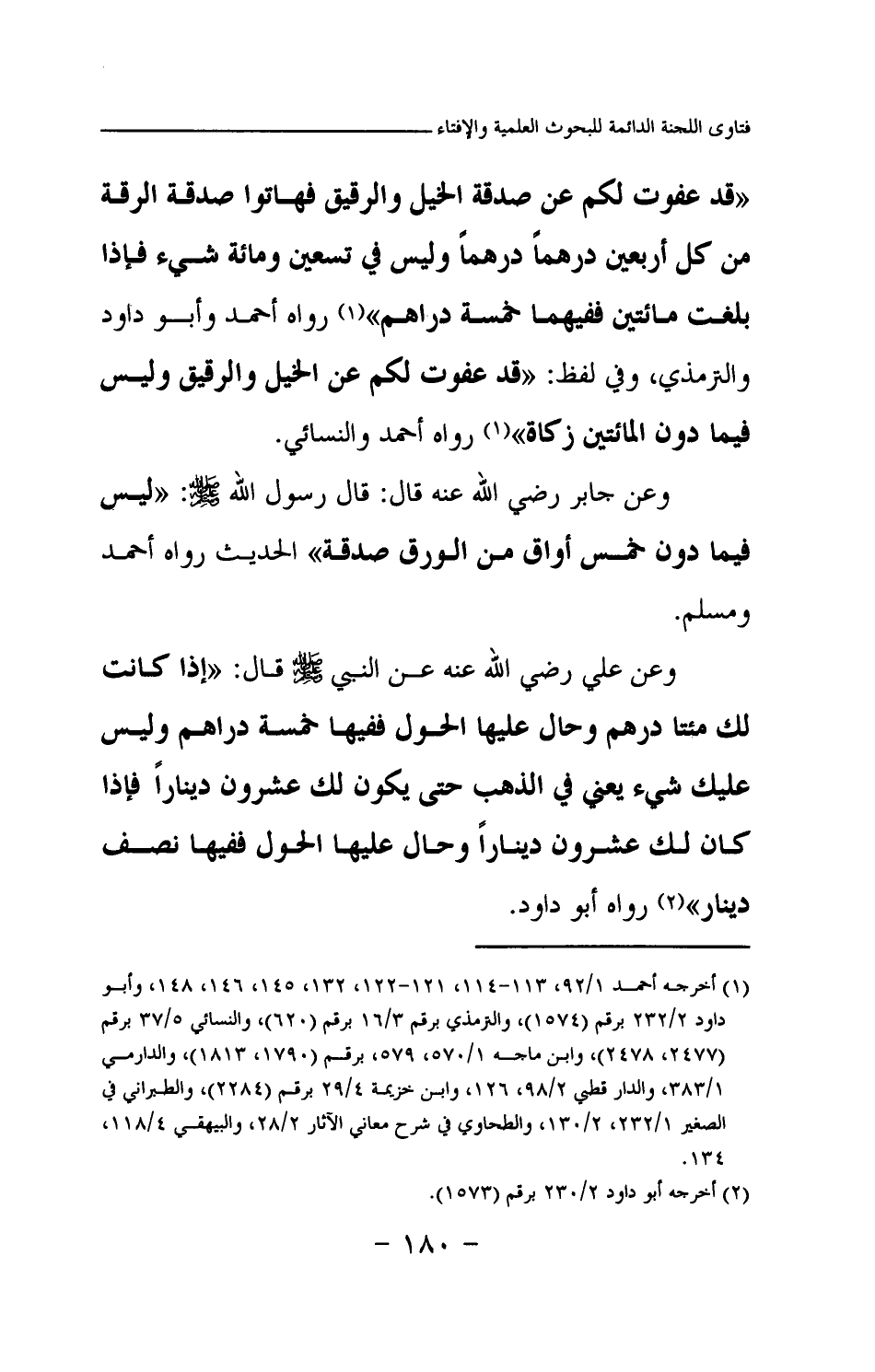 «قد عفوت لكم عن صدقة الخيل والرقيق فهاتوا صدقة الرقة من كل أربعين درهما درهما وليس في تسعين ومائة شيء فإذا بلغت مائتين ففيهما خمسة دراهم (¬1) » رواه أحمد وأبو داود والترمذي، وفي لفظ: «قد عفوت لكم عن الخيل والرقيق وليس فيما دون المائتين زكاة (¬2) » رواه أحمد والنسائي.