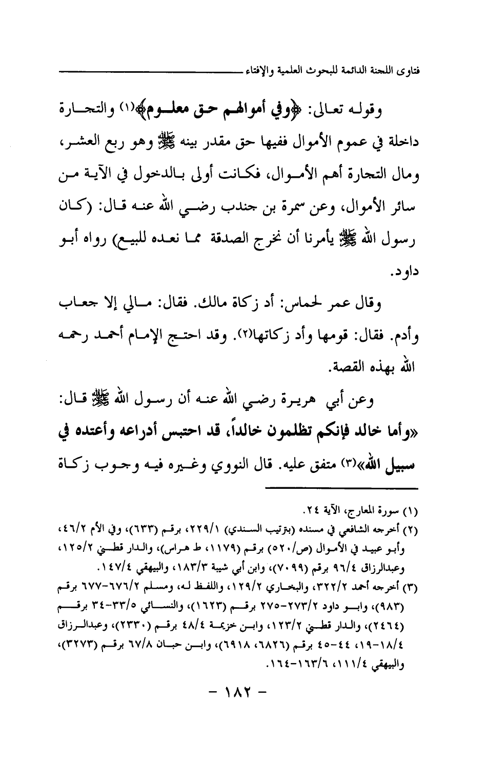 وعن أبي هريرة رضي الله عنه أن رسول الله صلى الله عليه وسلم قال: «وأما خالد فإنكم تظلمون خالدا، قد احتبس أدراعه وأعتده في سبيل الله (¬3) » متفق عليه قال النووي وغيره فيه وجوب زكاة