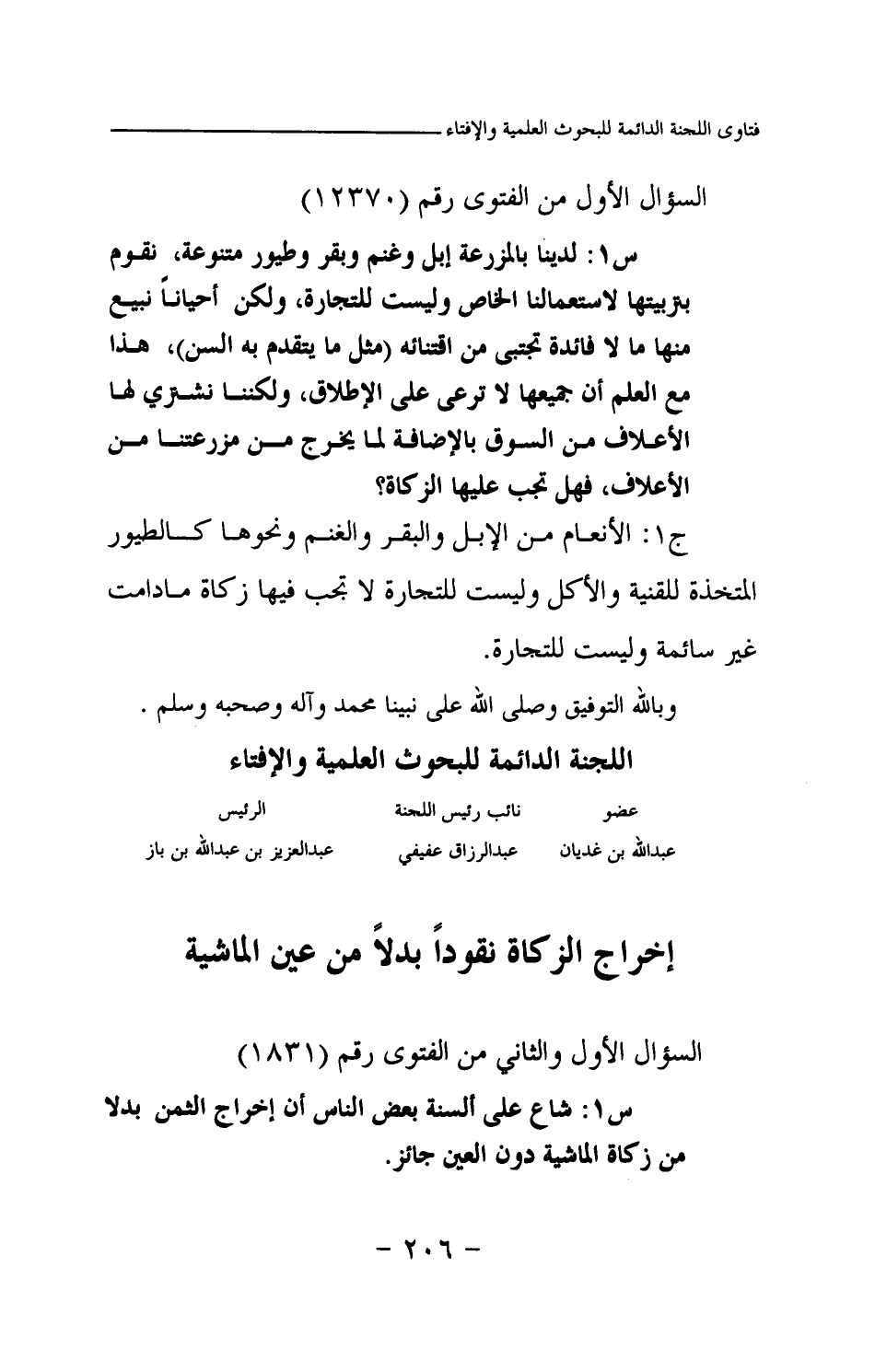 س1: لدينا بالمزرعة إبل وغنم وبقر وطيور متنوعة، نقوم بتربيتها لاستعمالنا الخاص وليست للتجارة، ولكن أحيانا نبيع منها ما لا فائدة تجتبى من اقتنائه (مثل ما يتقدم به السن) ، هذا مع العلم أن جميعها لا ترعى على الإطلاق، ولكننا نشتري لها الأعلاف من السوق بالإضافة لما يخرج من مزرعتنا من الأعلاف، فهل تجب عليها الزكاة؟
