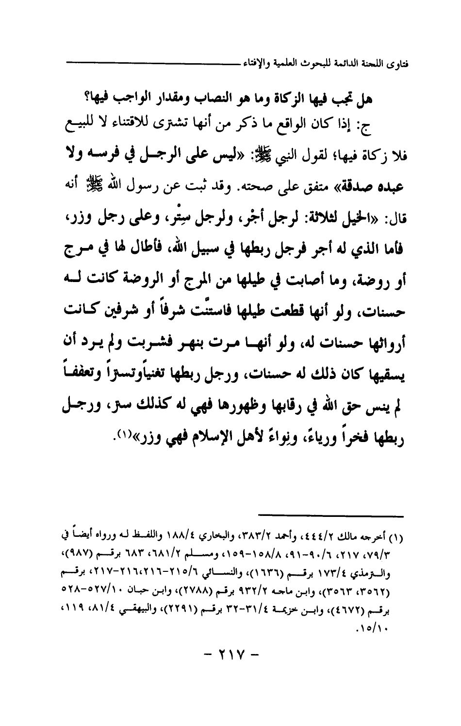 ج: إذا كان الواقع ما ذكر من أنها تشترى للاقتناء لا للبيع فلا زكاة فيها؛ لقول النبي صلى الله عليه وسلم: «ليس على الرجل في فرسه ولا عبده صدقة (¬1) » متفق على صحته وقد ثبت عن رسول الله صلى الله عليه وسلم أنه قال: «الخيل لثلاثة: لرجل أجر، ولرجل ستر، وعلى رجل وزر، فأما الذي له أجر فرجل ربطها في سبيل الله، فأطال لها في مرج أو روضة، وما أصابت في طيلها من المرج أو الروضة كانت له حسنات، ولو أنها قطعت طيلها فاستنت شرفا أو شرفين كانت أرواثها حسنات له، ولو أنها مرت بنهر فشربت ولم يرد أن يسقيها كان ذلك له حسنات، ورجل ربطها تغنيا وتسترا وتعففا لم ينس حق الله في رقابها وظهورها فهي له كذلك ستر، ورجل ربطها فخرا ورياء، ونواء لأهل الإسلام فهي وزر (¬2) » .