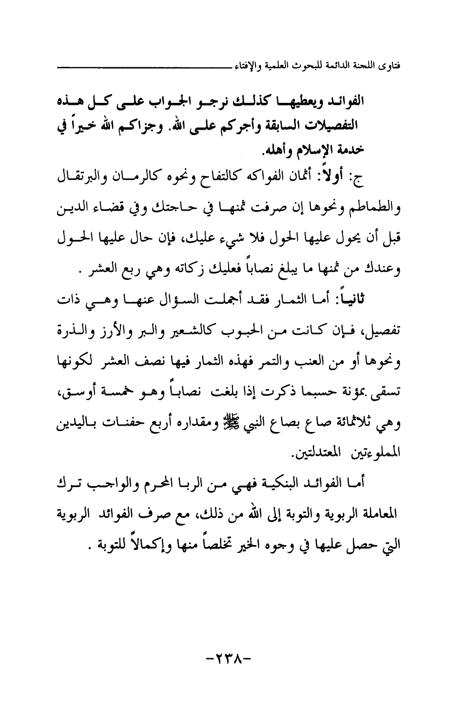 ج: أولا: أثمان الفواكه كالتفاح ونحوه كالرمان والبرتقال والطماطم ونحوها إن صرفت ثمنها في حاجتك وفي قضاء الدين قبل أن يحول عليها الحول فلا شيء عليك، فإن حال عليها الحول وعندك من ثمنها ما يبلغ نصابا فعليك زكاته وهي ربع العشر.
