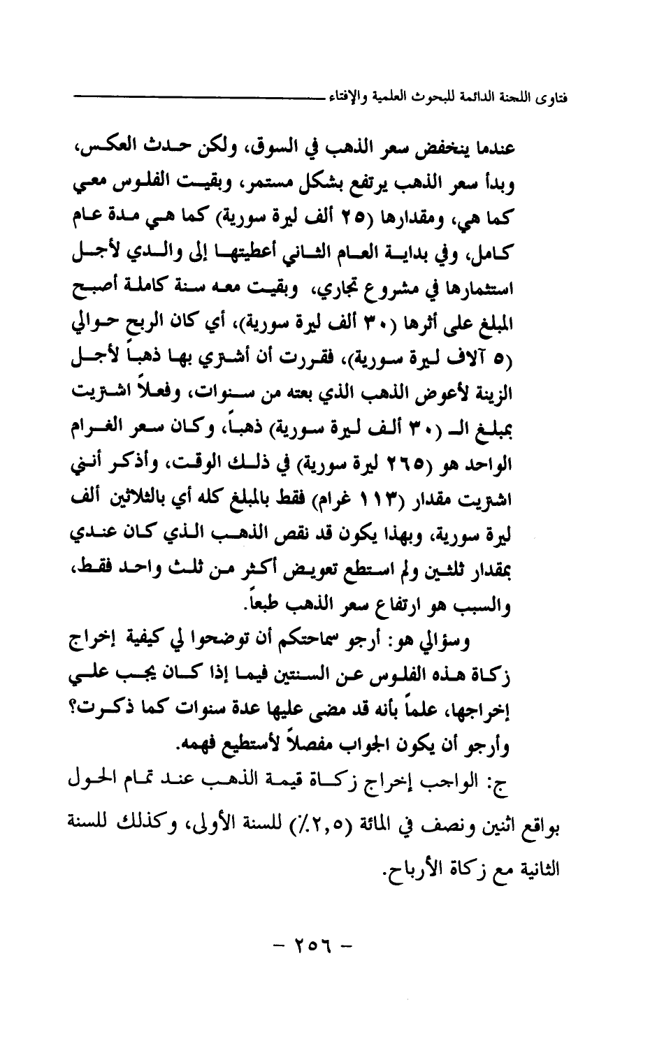 عندما ينخفض سعر الذهب في السوق، ولكن حدث العكس، وبدأ سعر الذهب يرتفع بشكل مستمر، وبقيت الفلوس معي كما هي، ومقدارها (25 ألف ليرة سورية) كما هي مدة عام كامل، وفي بداية العام الثاني أعطيتها إلى والدي لأجل استثمارها في مشروع تجاري، وبقيت معه سنة كاملة أصبح المبلغ على أثرها (30 ألف ليرة سورية) ، أي كان الربح حوالي (5 آلاف ليرة سورية) ، فقررت أن أشتري بها ذهبا لأجل الزينة لأعوض الذهب الذي بعته من سنوات، وفعلا اشتريت بمبلغ الـ (30 ألف ليرة سورية) ذهبا، وكان سعر الغرام الواحد هو (265 ليرة سورية) في ذلك الوقت، وأذكر أنني اشتريت مقدار (113 غرام) فقط بالمبلغ كله أي بالثلاثين ألف ليرة سورية، وبهذا يكون قد نقص الذهب الذي كان عندي بمقدار ثلثين ولم استطع تعويض أكثر من ثلث واحد فقط، والسبب هو ارتفاع سعر الذهب طبعا.