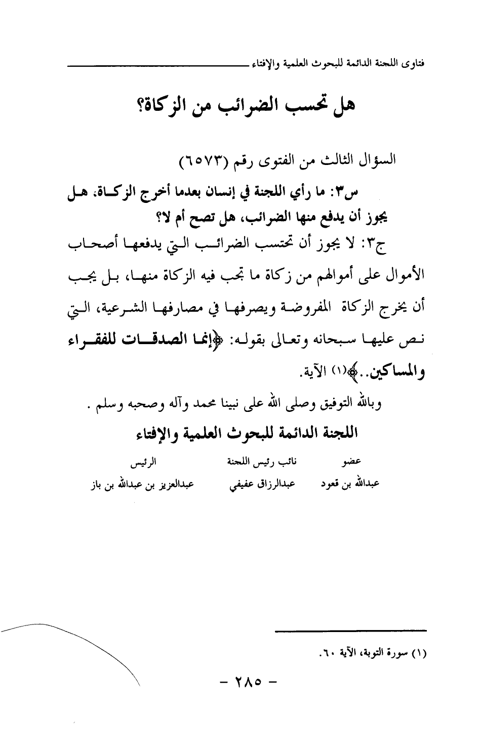 س3: ما رأي اللجنة في إنسان بعدما أخرج الزكاة، هل يجوز أن يدفع منها الضرائب، هل تصح أم لا؟