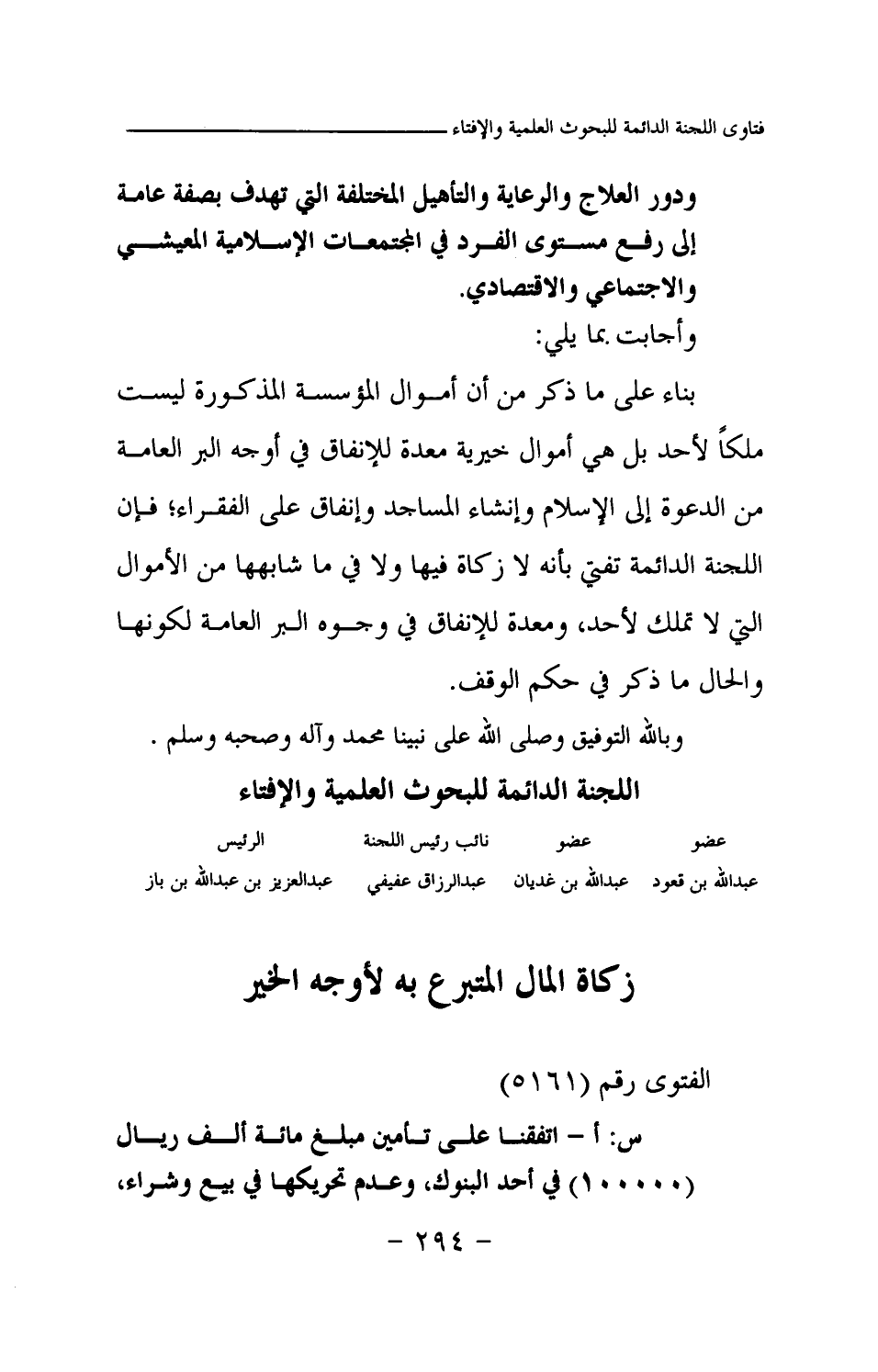 بناء على ما ذكر من أن أموال المؤسسة المذكورة ليست ملكا لأحد بل هي أموال خيرية معدة للإنفاق في أوجه البر العامة من الدعوة إلى الإسلام وإنشاء المساجد وإنفاق على الفقراء؛ فإن اللجنة الدائمة تفتي بأنه لا زكاة فيها ولا في ما شابهها من الأموال التي لا تملك لأحد، ومعدة للإنفاق في وجوه البر العامة لكونها والحال ما ذكر في حكم الوقف.