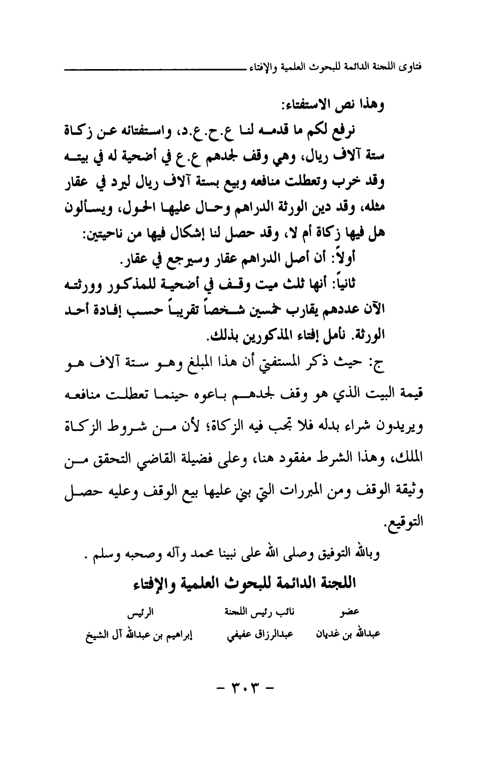 ج: حيث ذكر المستفتي أن هذا المبلغ وهو ستة آلاف هو قيمة البيت الذي هو وقف لجدهم باعوه حينما تعطلت منافعه ويريدون شراء بدله فلا تجب فيه الزكاة؛ لأن من شروط الزكاة الملك، وهذا الشرط مفقود هنا، وعلى فضيلة القاضي التحقق من وثيقة الوقف ومن المبررات التي بني عليها بيع الوقف وعليه حصل التوقيع.