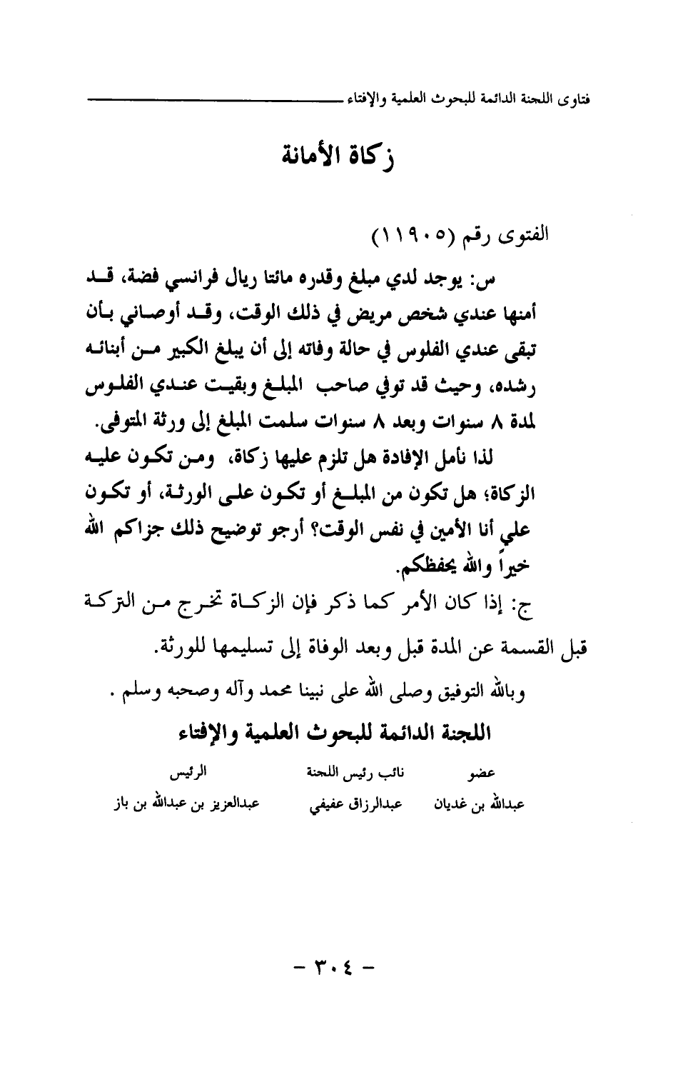 س: يوجد لدي مبلغ وقدره مائتا ريال فرانسي فضة، قد أمنها عندي شخص مريض في ذلك الوقت، وقد أوصاني بأن تبقى عندي الفلوس في حالة وفاته إلى أن يبلغ الكبير من أبنائه رشده، وحيث قد توفي صاحب المبلغ وبقيت عندي الفلوس لمدة 8 سنوات وبعد 8 سنوات سلمت المبلغ إلى ورثة المتوفى.