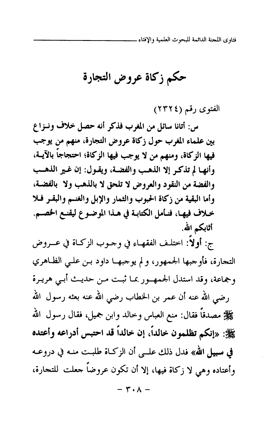 ج: أولا: اختلف الفقهاء في وجوب الزكاة في عروض التجارة، فأوجبها الجمهور، ولم يوجبها داود بن علي الظاهري وجماعة، وقد استدل الجمهور بما ثبت من حديث أبي هريرة رضي الله عنه أن عمر بن الخطاب رضي الله عنه بعثه رسول الله صلى الله عليه وسلم مصدقا فقال: منع العباس وخالد وابن جميل، فقال رسول الله صلى الله عليه وسلم: «إنكم تظلمون خالدا، إن خالدا قد احتبس أدراعه وأعتده في سبيل الله (¬1) » فدل ذلك على أن الزكاة طلبت منه في دروعه وأعتاده وهي لا زكاة فيها، إلا أن تكون عروضا جعلت للتجارة،