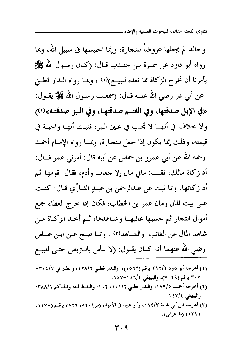 وخالد لم يجعلها عروضا للتجارة، وإنما احتبسها في سبيل الله، وبما رواه أبو داود عن سمرة بن جندب قال: «كان رسول الله صلى الله عليه وسلم يأمرنا أن نخرج الزكاة مما نعده للبيع (¬1) » وبما رواه الدارقطني عن أبي ذر رضي الله عنه قال: (سمعت رسول الله صلى الله عليه وسلم يقول: «في الإبل صدقتها، وفي الغنم صدقتها، وفي البز صدقته (¬2) » ولا خلاف في أنها لا تجب في عين البز، فثبت أنها واجبة في قيمته، وذلك إنما يكون إذا جعل للتجارة، وبما رواه الإمام أحمد رحمه الله عن أبي عمرو بن حماس عن أبيه قال: أمرني عمر قال: أد زكاة مالك، فقلت: مالي مال إلا جعاب وأدم، فقال: قومها ثم أد زكاتها. وبما ثبت عن عبد الرحمن بن عبد القاري قال: كنت على بيت المال زمان عمر بن الخطاب، فكان إذا خرج العطاء جمع أموال التجار ثم حسبها غائبها وشاهدها، ثم أخذ الزكاة من شاهد المال عن الغائب والشاهد (¬3) . وبما صح عن ابن عباس رضي الله عنهما أنه كان يقول: (لا بأس بالتربص حتى المبيع
