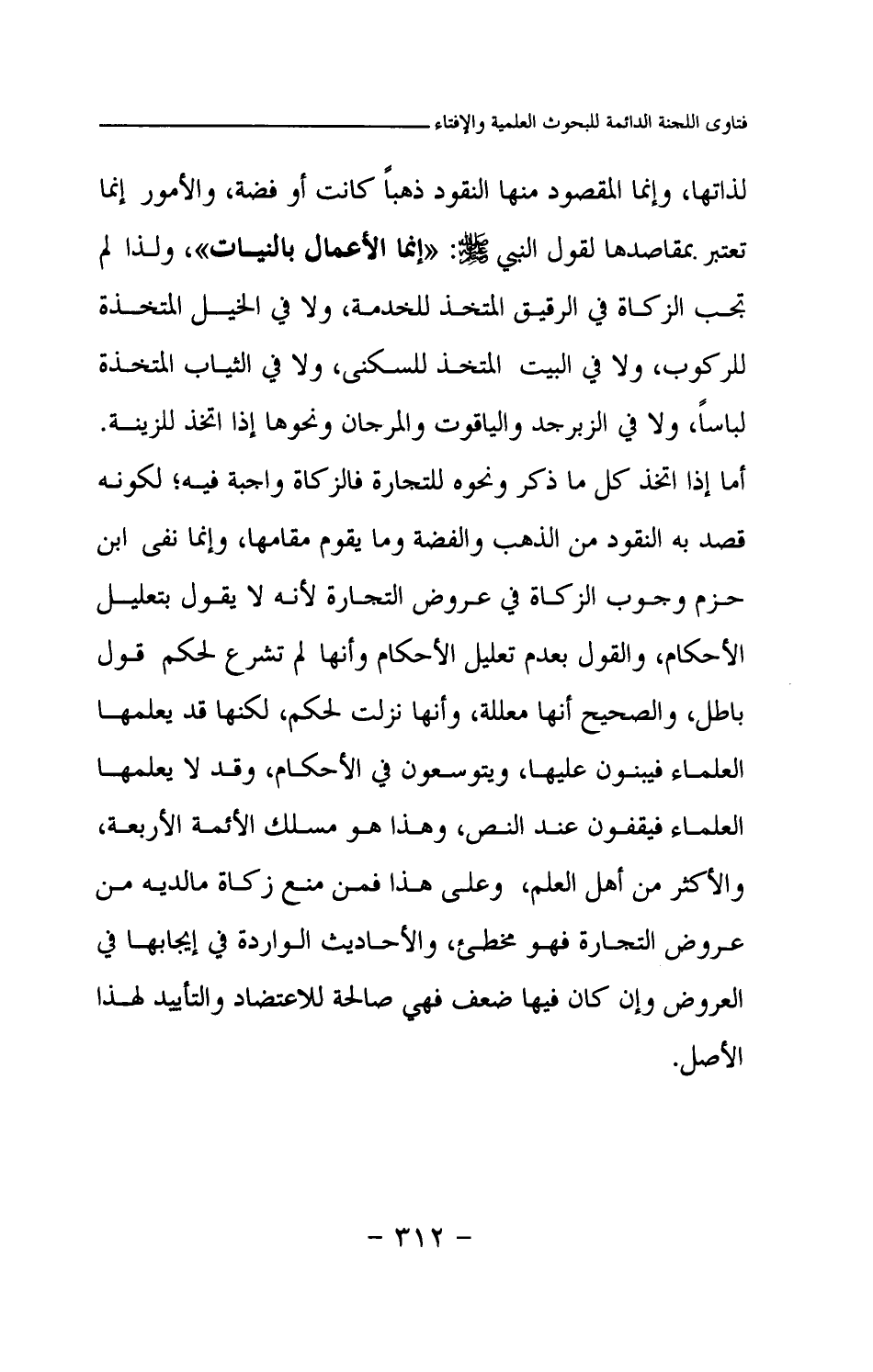 لذاتها، وإنما المقصود منها النقود ذهبا كانت أو فضة، والأمور إنما تعتبر بمقاصدها لقول النبي صلى الله عليه وسلم «إنما الأعمال بالنيات (¬1) » ولذا لم تجب الزكاة في الرقيق المتخذ للخدمة، ولا في الخيل المتخذة للركوب، ولا في البيت المتخذ للسكنى، ولا في الثياب المتخذة لباسا، ولا في الزبرجد والياقوت والمرجان ونحوها إذا اتخذ للزينة. أما إذا اتخذ كل ما ذكر ونحوه للتجارة فالزكاة واجبة فيه؛ لكونه قصد به النقود من الذهب والفضة وما يقوم مقامها، وإنما نفى ابن حزم وجوب الزكاة في عروض التجارة لأنه لا يقول بتعليل الأحكام، والقول بعدم تعليل الأحكام وأنها لم تشرع لحكم قول باطل، والصحيح أنها معللة، وأنها نزلت لحكم، لكنها قد يعلمها العلماء فيبنون عليها، ويتوسعون في الأحكام، وقد لا يعلمها العلماء فيقفون عند النص، وهذا هو مسلك الأئمة الأربعة، والأكثر من أهل العلم، وعلى هذا فمن منع زكاة ما لديه من عروض التجارة فهو مخطئ، والأحاديث الواردة في إيجابها في العروض وإن كان فيها ضعف فهي صالحة للاعتضاد والتأييد لهذا الأصل.