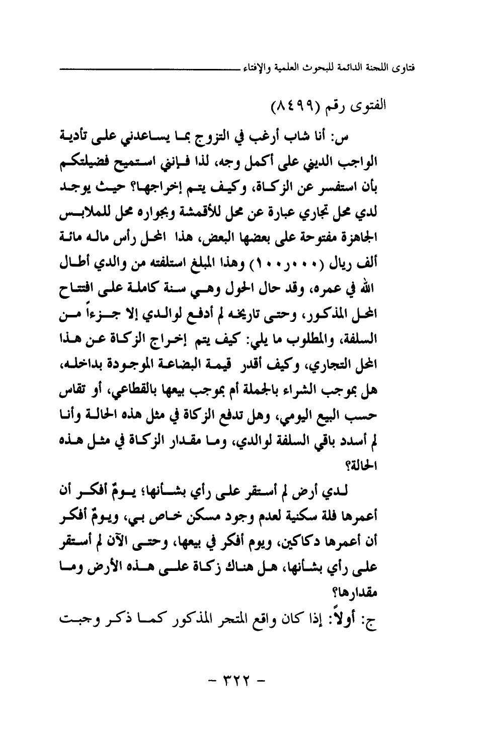 س: أنا شاب أرغب في التزوج بما يساعدني على تأدية الواجب الديني على أكمل وجه، لذا فإنني استميح فضيلتكم بأن استفسر عن الزكاة، وكيف يتم إخراجها؟ حيث يوجد لدي محل تجاري عبارة عن محل للأقمشة وبجواره محل للملابس الجاهزة مفتوحة على بعضها البعض، هذا المحل رأس ماله مائة ألف ريال (100000) وهذا المبلغ استلفته من والدي أطال الله في عمره، وقد حال الحول وهي سنة كاملة على افتتاح المحل المذكور، وحتى تاريخه لم أدفع لوالدي إلا جزءا من السلفة، والمطلوب ما يلي: كيف يتم إخراج الزكاة عن هذا المحل التجاري، وكيف أقدر قيمة البضاعة الموجودة بداخله، هل بموجب الشراء بالجملة أم بموجب بيعها بالقطاعي، أو تقاس حسب البيع اليومي، وهل تدفع الزكاة في مثل هذه الحالة وأنا لم أسدد باقي السلفة لوالدي، وما مقدار الزكاة في مثل هذه الحالة؟ لدي أرض لم أستقر على رأي بشأنها؛ يوم أفكر أن أعمرها فلة سكنية لعدم وجود مسكن خاص بي، ويوم أفكر أن أعمرها دكاكين، ويوم أفكر في بيعها، وحتى الآن لم أستقر على رأي بشأنها، هل هناك زكاة على هذه الأرض وما مقدارها؟